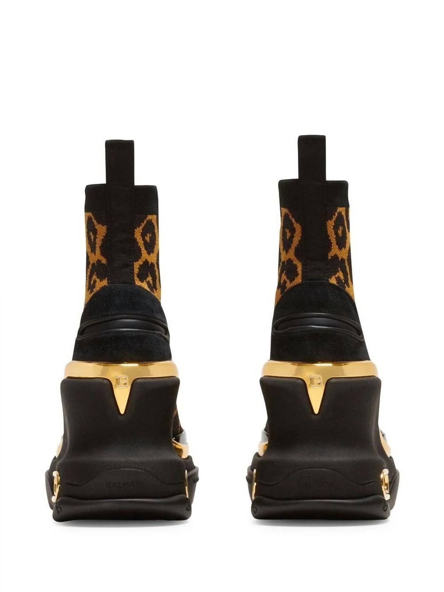 Step into chic style with the Women's Leopard B-bold Wedge High-top Sneakers by Balmain, featuring a striking leopard-print knit fabric design. These sneakers boast a wedge heel with metallic insets and an almond toe, complemented by an elastic collar with a convenient pull-tab for a sleek, pull-on style. Meticulously crafted in Italy, they ensure quality with a 100% rubber outsole and 100% fabric lining. Heel height measures an impressive 4 inches, offering an elevated yet comfortable wear.