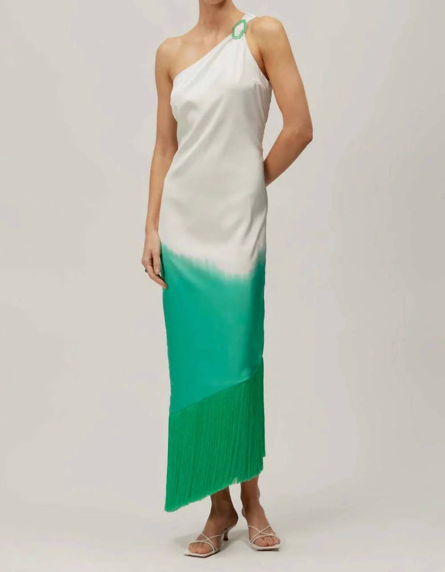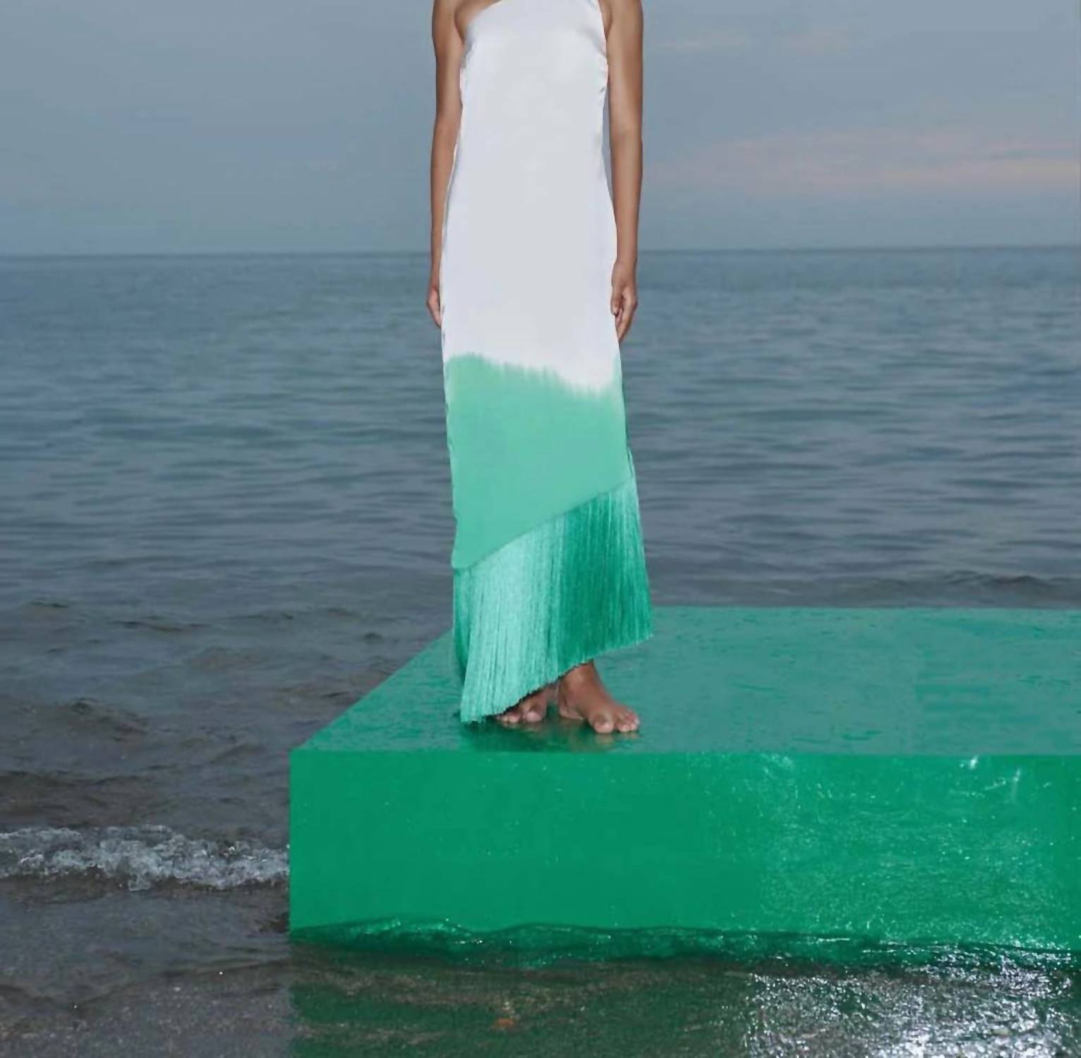 The Amelia Maxi Dress by BAOBAB in Sage Ombre is a statement piece with its sleeveless, one-shoulder silhouette and unique Baobab-shaped accents. Made from a blend of recycled and traditional polyester with elastane, this textured slip dress offers a flowing maxi length and is fully lined for comfort. It features a discreet zip closure, perfect for summer vacations or any stylish evening event. Care instructions recommend dry cleaning to maintain its elegance.