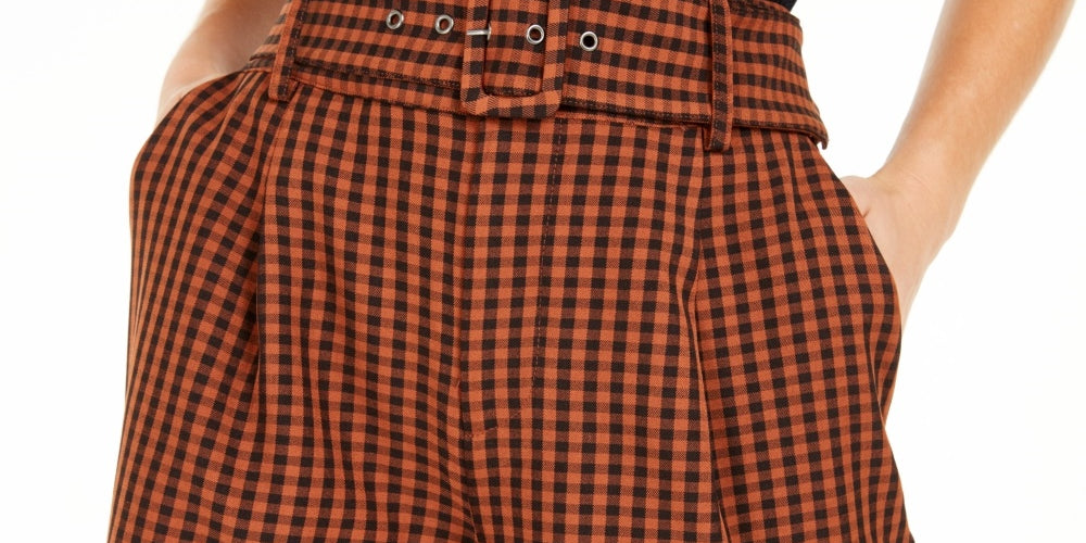 Approx. inseam: 4"|Front rise: approx. 13-1/2"; back rise: approx. 16-1/2"; fitted through hips and thighs; cuffed leg|Zipper, hook-and-bar and button closure at front fly; belt loops|Wide matching belt with covered buckle; inverted pleats at side front|Side-seam pockets; welt pockets at back