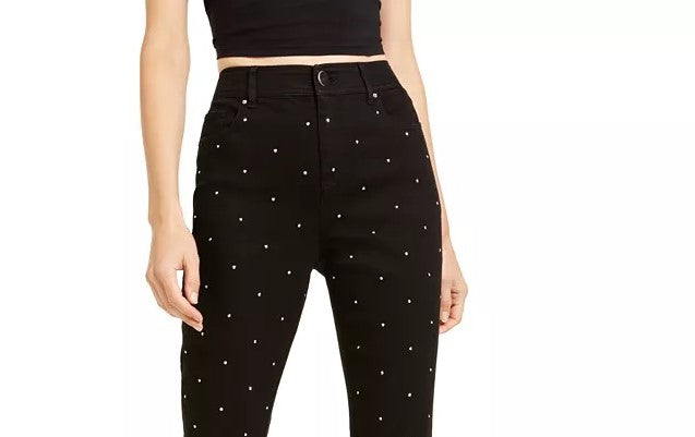 Approx. inseam: 28"|Approx. front rise: 10-63/100"; back rise: 15-19/50"|Zipper and button closure; belt loops|Studded accents at front; five pocket styling|Cotton/polyester/spandex