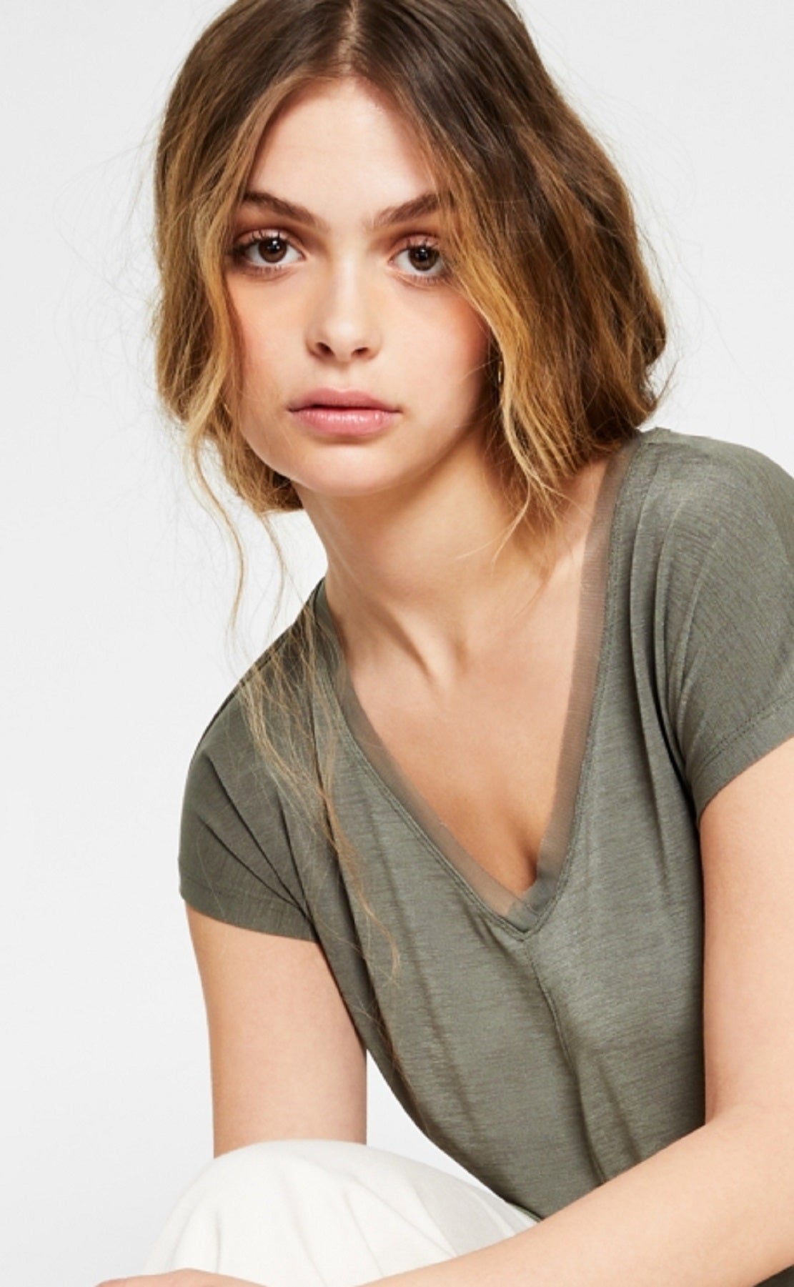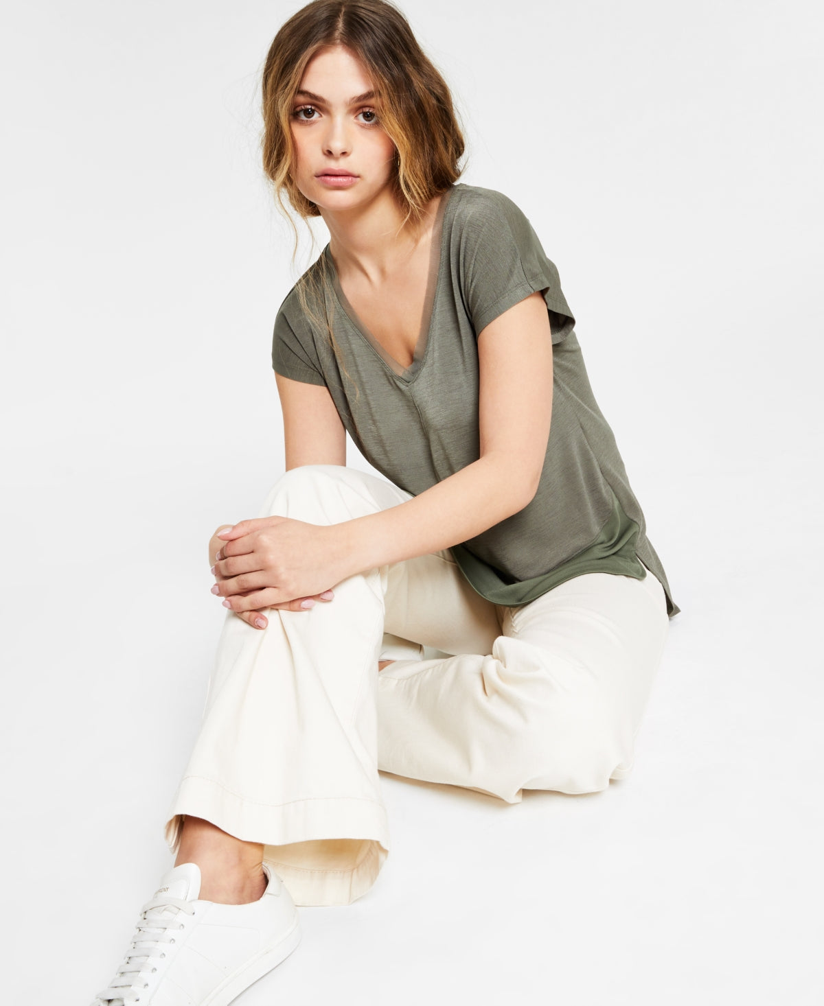 V-neckline; pullover styling|Imported|Mixed Media; Contrast fabric at hem and neckline