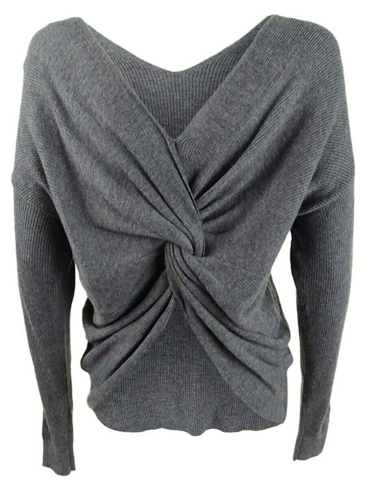 Approx. model height is 5'10" and she is wearing a size small|Relaxed fit; hits at thigh|Twist back detail; asymmetrical hem, can wear twist detail in front or back|Long sleeve|Acrylic/nylon/wool|Machine washable