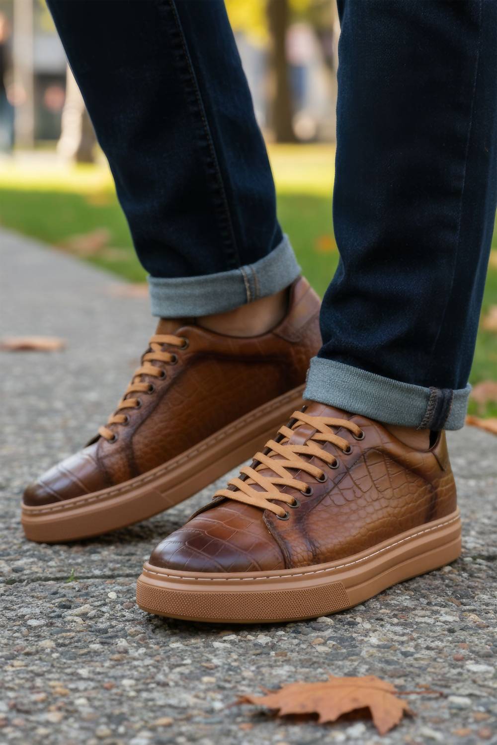 Introducing the Men's Serpent Flash Low Top Sneakers by BARABAS, crafted with a distinct leather snakeskin design in an eye-catching brown. The leather upper and lining ensure a premium feel, complemented by a durable rubber sole that features a lightweight traction bottom for stability. These sneakers come with cushy memory foam insoles offering all-day breathable comfort. Closure is via professional packaging with spot cleaning recommended for care.