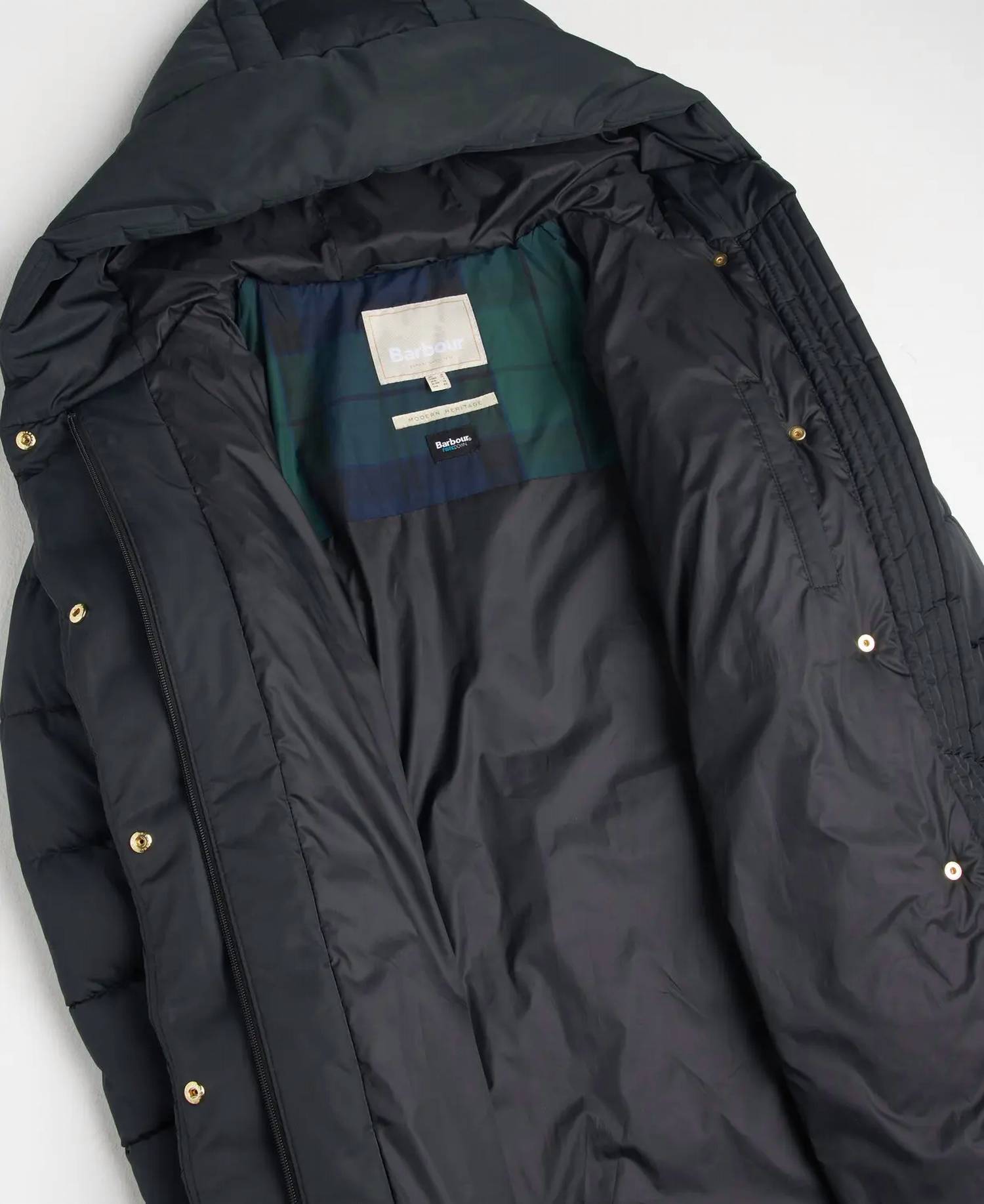 Stay stylish this winter with the Barbour Alexandria Quilted Puffer Coat, designed with long sleeves and a hooded neckline to keep you warm. This 45" long coat is made from 100% polyester and features luxurious padding, produced for women seeking both comfort and fashion. It boasts a snap closure and an elasticated waist complemented by a patterned drawcord for a contemporary fit. With its solid black color, this machine-washable coat is perfect for your Christmas travel plans and adds a touch of athleisure to your winter wardrobe.