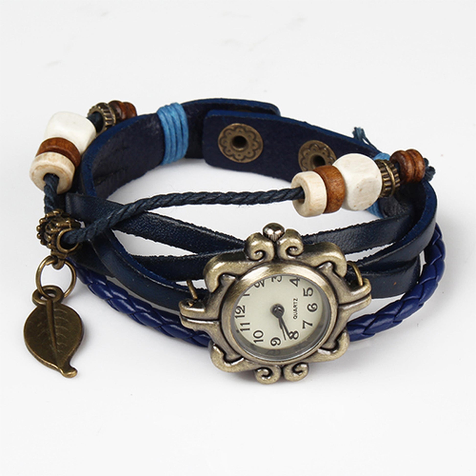 Beautiful Bohemian Style Retro Handmade Leather Tree Leaf Women\'s Watches-blue