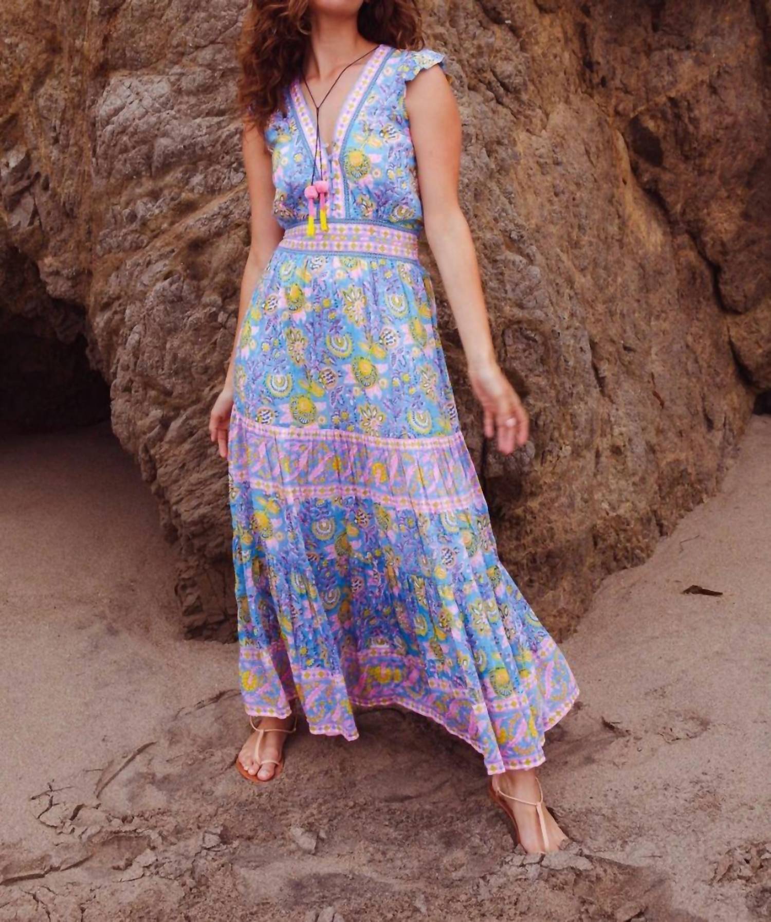 A midi dress so versatile, your options for wearing it are endless. Introducing the Annabelle Maxi by BELL, a perfect choice for a stylish summer dinner party. This patterned dress in a blue and yellow print features ruffled cap sleeves and an elegant V-neckline with a charming tassel-tie detail. Crafted from silk cotton voile, it showcases a fitted waist with picot trim, a tiered skirt, and a back smocked waistband for added comfort. Made in India with a button closure at the front bodice, elevate your wardrobe with this sophisticated piece.