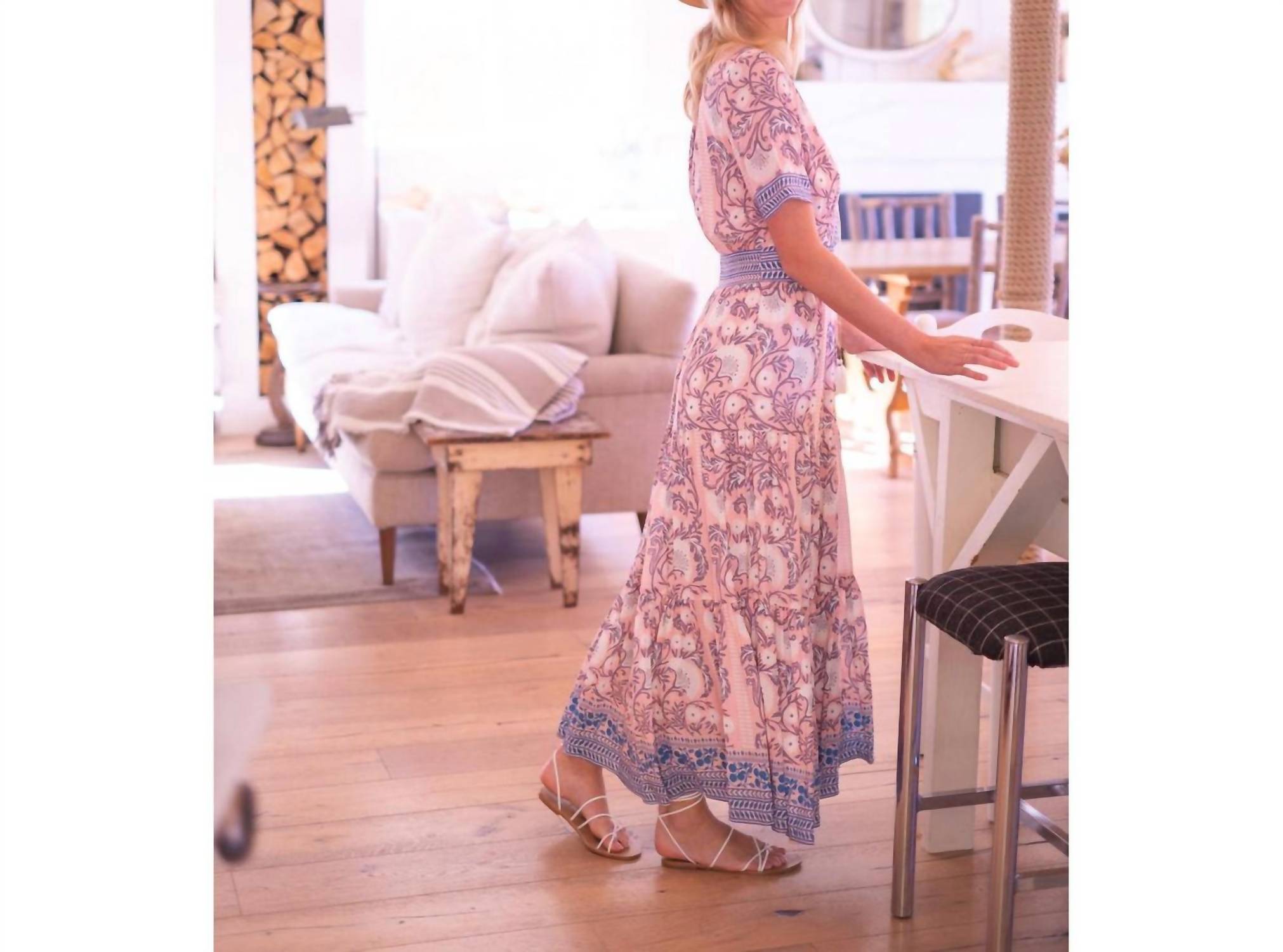 Introducing the Bianca Maxi Dress by BELL in a vibrant Salmon Teal Print, designed for chic versatility. This dress features short sleeves and a flowing A-line silhouette crafted from buttery soft viscose with artisanal hand block-printing. Its charming tassel-tie neckline and elastic back waist enhance both comfort and style, making it ideal for summer getaways and casual outings. With a boho chic vibe, this dress is perfect for your vacation wardrobe.
