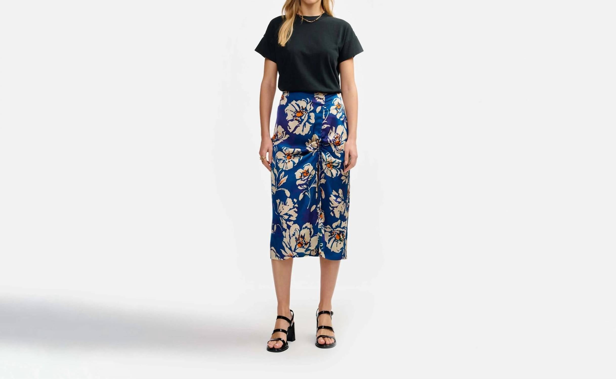 The midi length skirt is here to stay and we especially love this style. This ruched midi skirt brings a fresh twist to a classic tube silhouette with standout details. Crafted from 100% Ecovero viscose, it features a front slit, adjustable string accents, and eye-catching ruching. A bold all-over print adds a vibrant finishing touch, making it a striking piece for any wardrobe.
