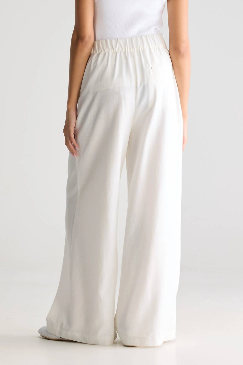 Meet the Vezza Wide Trousers by Bellerose, a chic addition to your wardrobe perfect for travel or a minimalist summer look. These white, high-rise trousers feature a comfortable elasticated waistband and wide-leg design, ensuring a relaxed fit. Crafted from a viscose blend with cotton pocket lining, they boast a 30" inseam and are made in Tunisia. Closure: Pull-on style with concealed pockets. Care: Hand wash recommended.