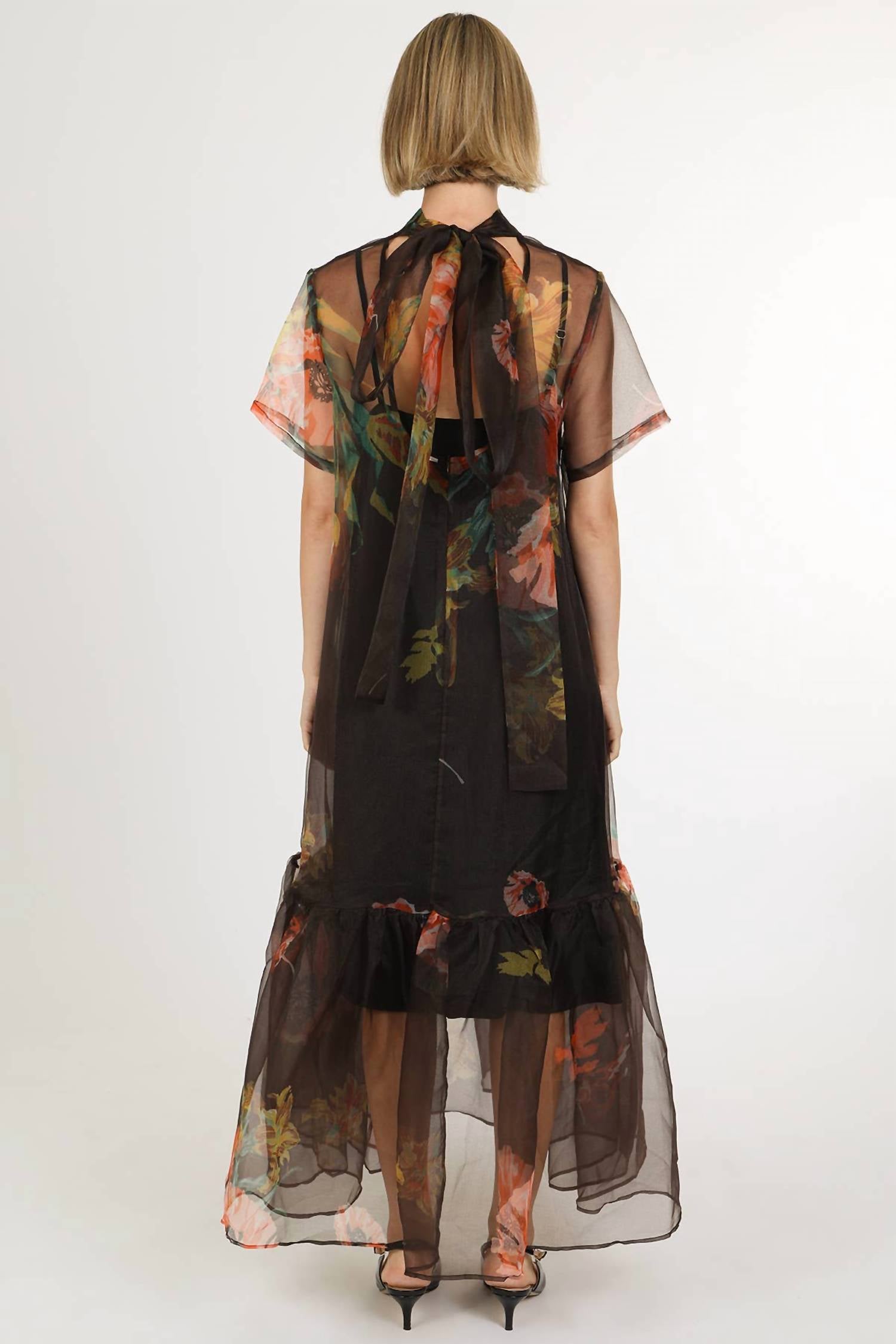 Just add slides or mules and you are good to go. The Caroleena Floral Print Sheer Dress by BEULAHSTYLE is a stunning addition to any wardrobe, perfect for evening events. This coffee-colored A-line midi dress features short sleeves and a mockneck design. Made with delicate organza, it showcases a tiered tulle hem and a chic scoop back with a functional tie closure. Care is simple with a hand wash recommendation, ensuring lasting quality for boho chic occasions.