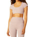 Introducing the Spacedye What's The Scoop Bra by Beyond Yoga, a chic and versatile top in a solid Chai color. Featuring cap sleeves and a scoop neckline, this crop top is crafted from soft 87% Polyester, 13% Elastane for comfort. It comes with a banded waist and a convenient pull-on closure, ideal for fitness or casual outings. Care instructions: Machine wash. Suitable for activewear enthusiasts and perfect for summer.