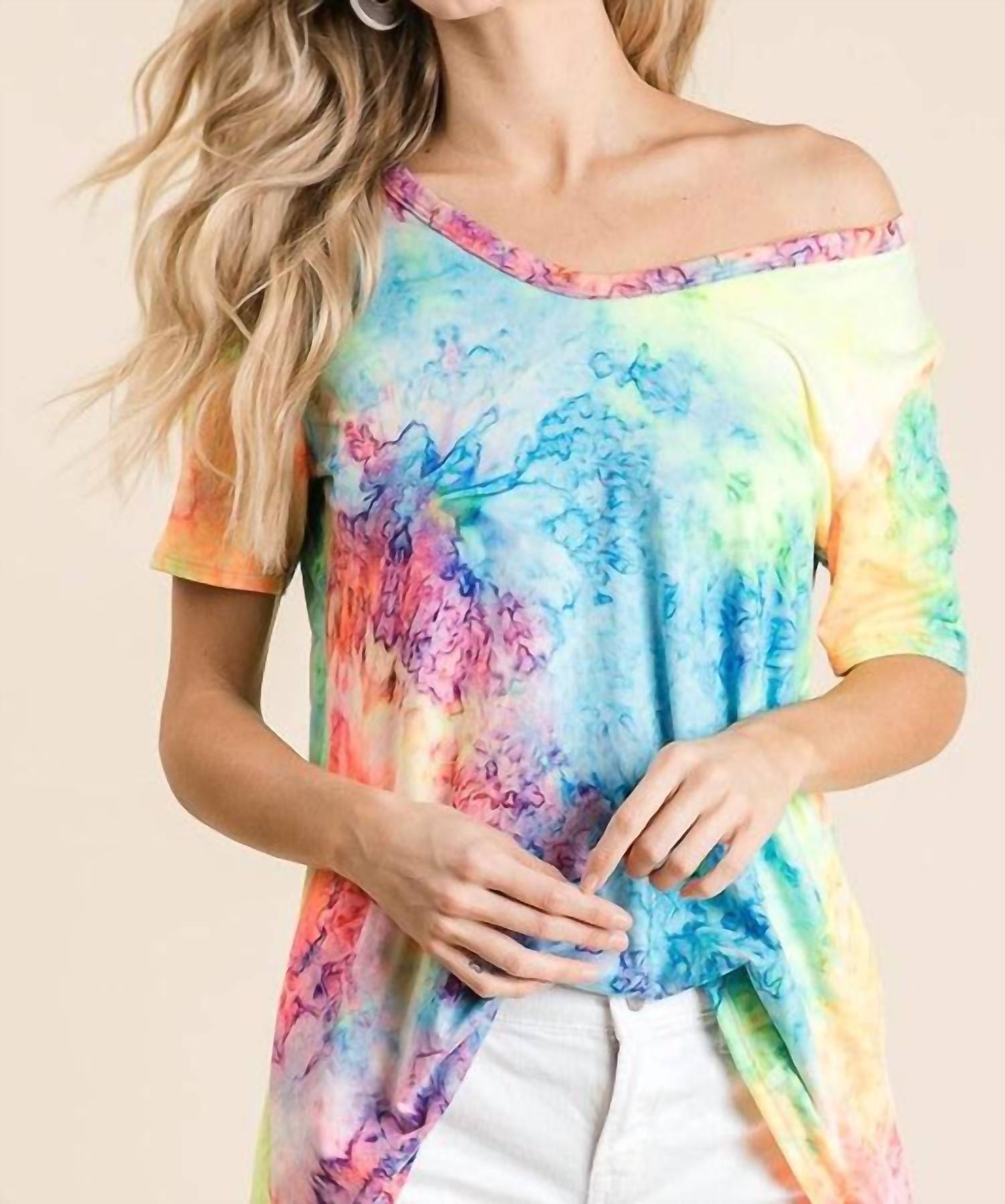 This classic, short sleeve tee will be your go-to staple this season and beyond. Introducing the Neon Tie Dye Top by BiBi, a vibrant streetwear piece perfect for summer festivities. It features a V-neckline with short sleeves and a trendy rounded hem, crafted from a lightweight, stretchy jersey for comfortable wear. The composition is 96% polyester and 4% spandex, and it has a pull-on closure. For best care, hand wash with cold water, line dry, and avoid bleach to maintain its unique tie-dye pattern. Available sizes ensure a flattering fit, with dimensions such as a 38" bust and 27" length for size small.