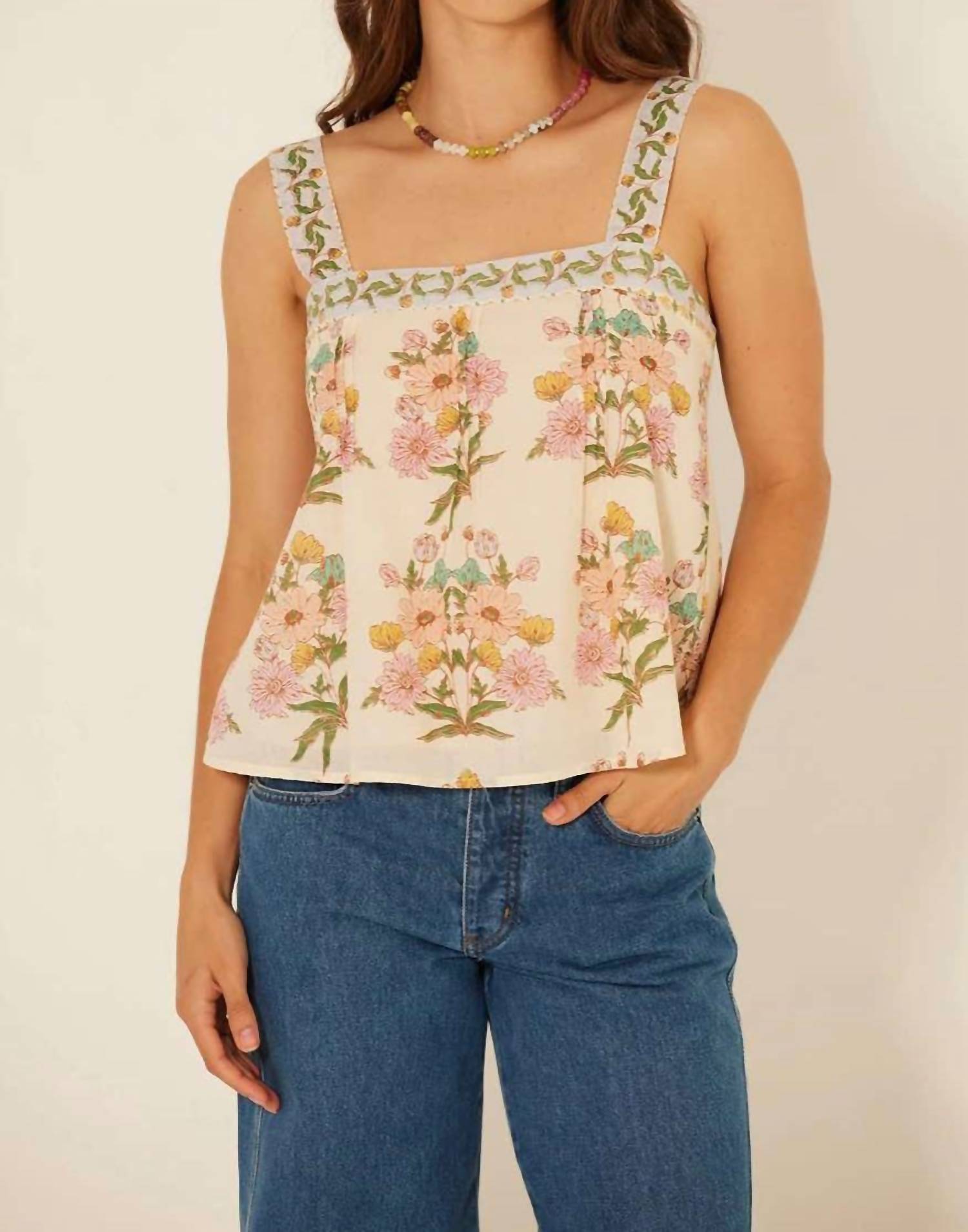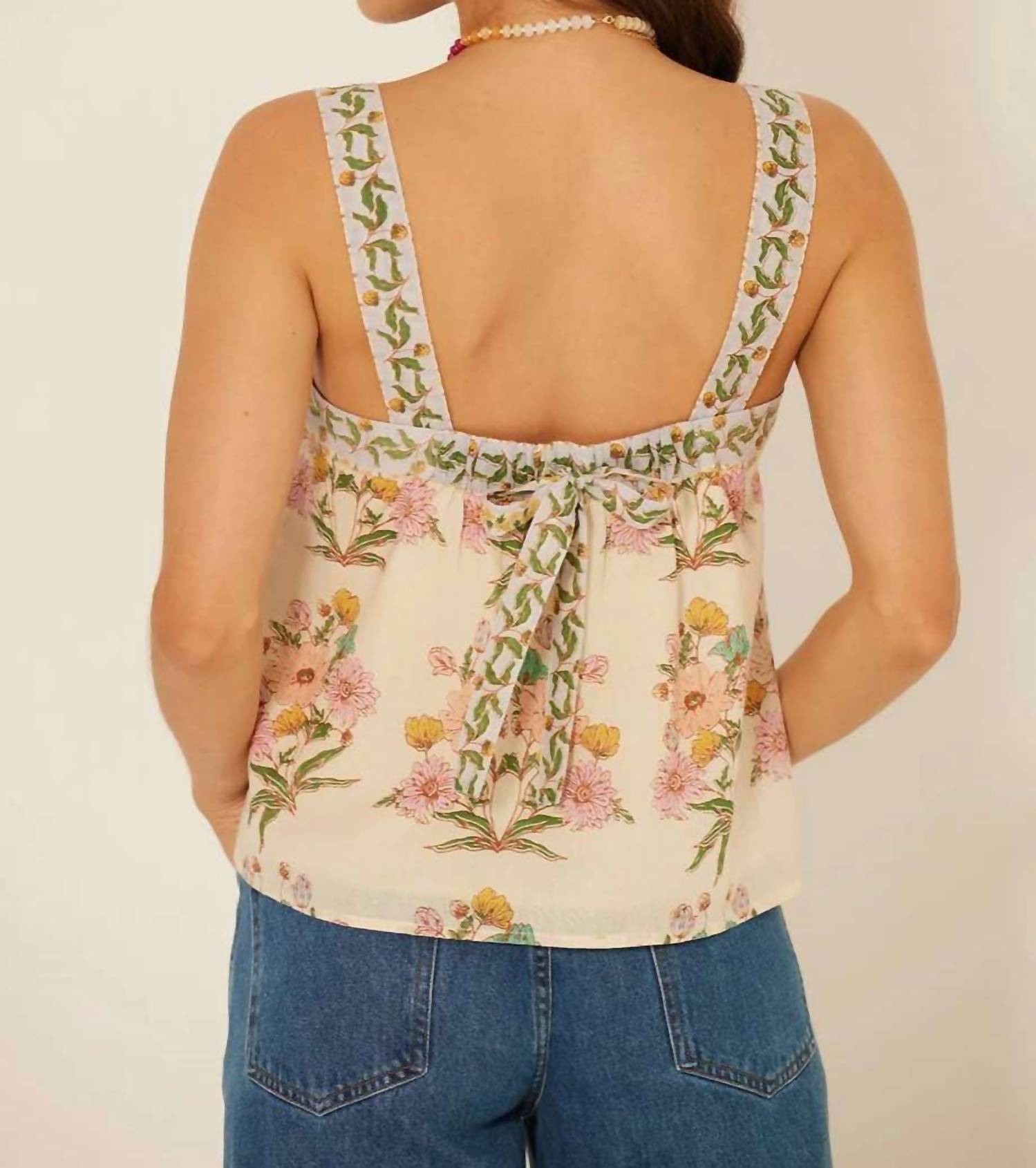 Tuck this cami into your favorite pair of jeans for a casual yet polished look. Introducing the BILA77 Lucia Top, a multi-colored sleeveless camisole with a boho chic flair. This elegant top features wide straps for added comfort and a distinctive border print, enhancing its sophisticated appeal. With a pull-on closure, it offers a relaxed fit, highlighted by a square neckline and tie-back details for customization. Care is simple with hand wash instructions, making it an ideal choice for summer gatherings or dinner parties.