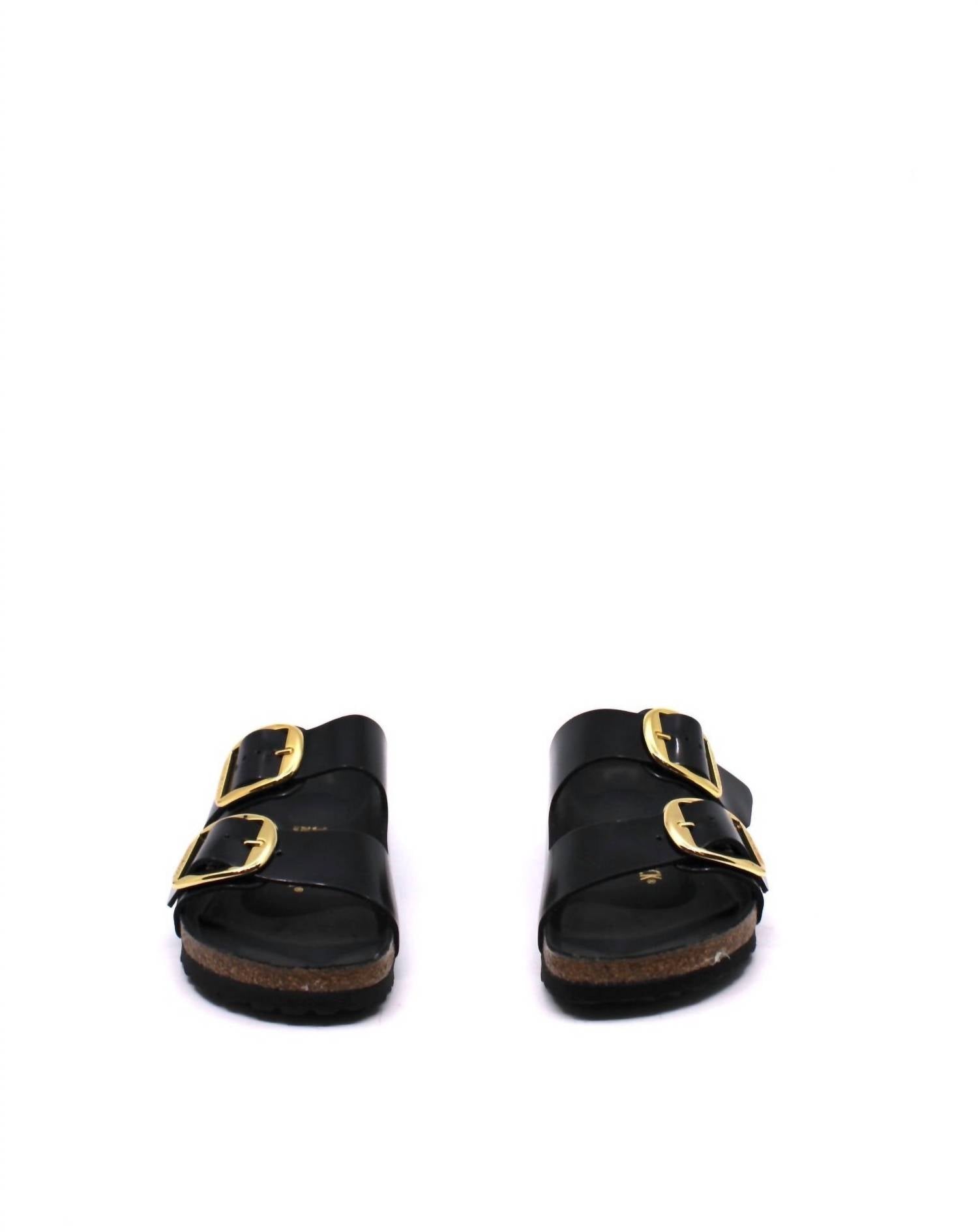 Natural Leather Patent. Two straps, each with a large, individually adjustable metal pin buckle; color-coordinated details. Anatomically shaped cork-latex footbed; semi-exquisite. Upper: natural leather with a high shine finish. Footbed lining: piumato leather. Sole: EVA.Made in Germany