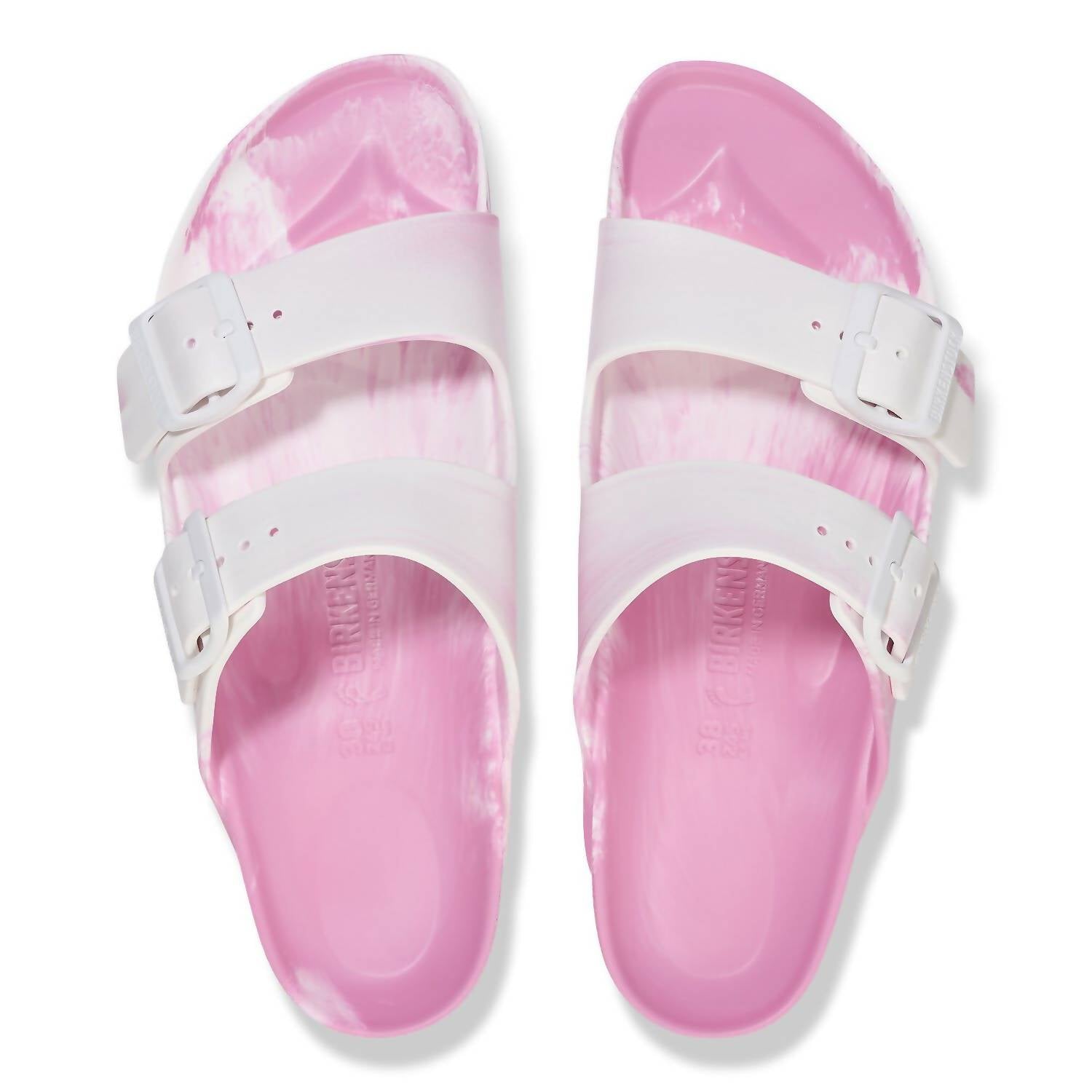 Flowy dresses, cropped pants, and even jumpsuits... this sandal works with them all! Step into supreme comfort with the Women's Arizona EVA Sandal by BIRKENSTOCK, crafted in a vibrant Multi Pink. These sandals boast an anatomically shaped footbed made from a single piece of EVA, offering remarkable waterproof, washable, and ultra-lightweight features. Made in Germany, they promise quality and durability in every step. Designed with an open toe and flat heel, they make an ideal choice for all-day wear.