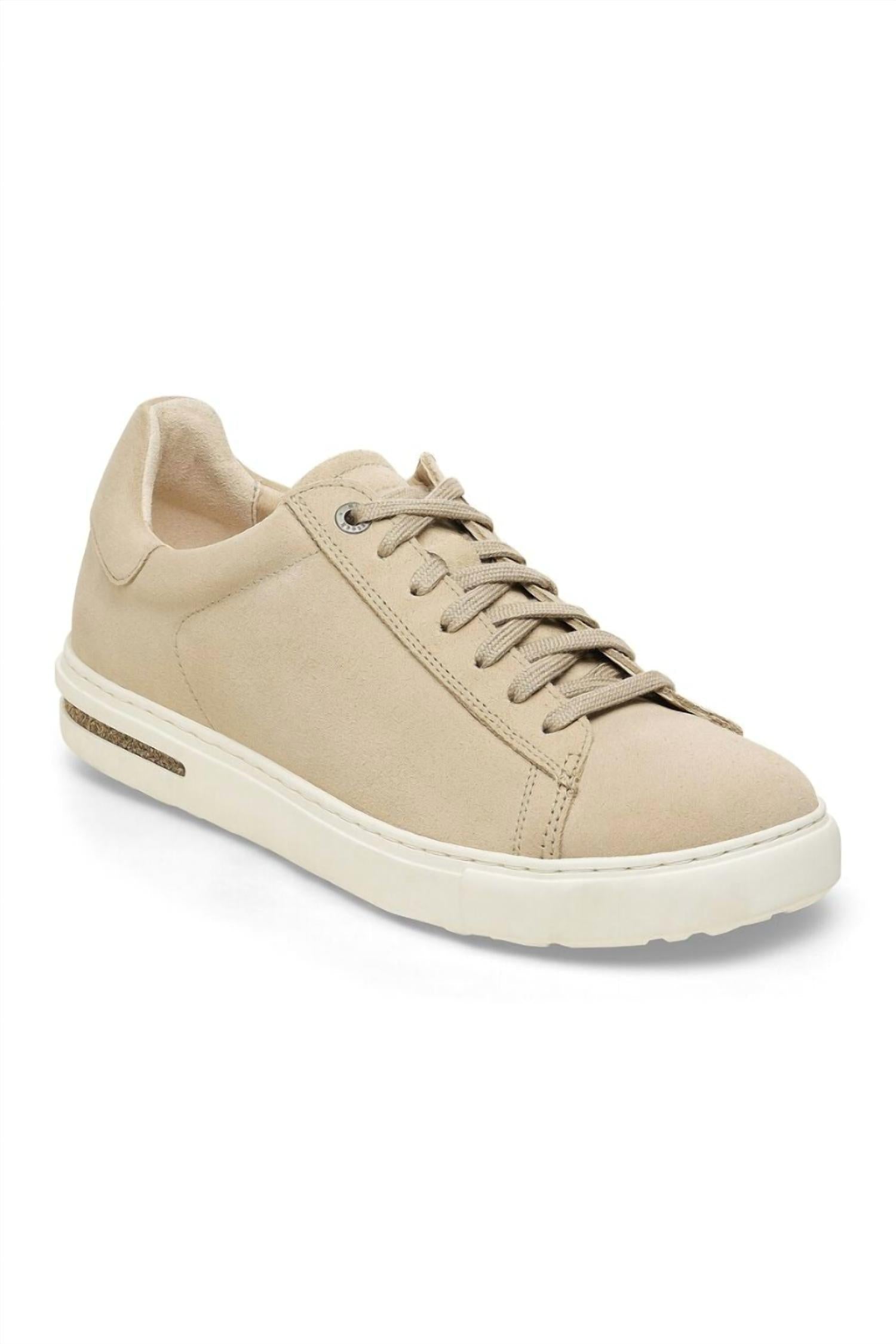 Experience the Women's Bend Low Suede Leather Sneaker by BIRKENSTOCK, a chic yet comfortable choice in a sandcastle hue. Crafted in Portugal, these sneakers feature a soft suede upper, a natural leather footbed lining, and a durable natural rubber sole. The removable, anatomically shaped cork-latex footbed ensures all-day support with a street-smart style. Designed for women with a medium width and a flat heel under 1 inch, these sneakers redefine casual comfort.