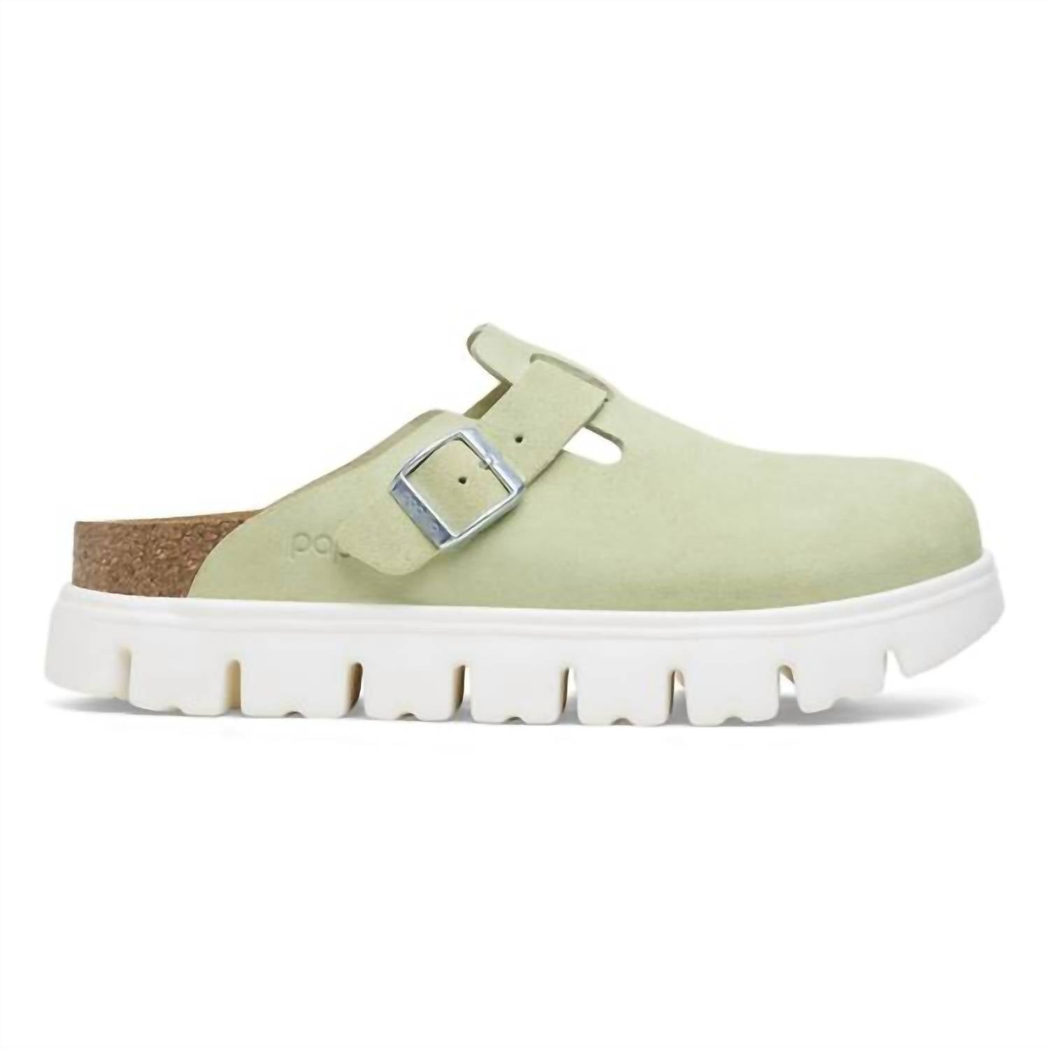 A trend that everyone is loving and this style might just be our favorite. Elevate your style with the Unisex Boston Chunky Clog by BIRKENSTOCK in a chic Faded Lime finish. This suede masterpiece features an adjustable strap and a platform EVA sole with a 1.25" heel height, offering both comfort and a modern edge. Expertly crafted with a contoured cork-latex footbed and a suede footbed lining, it promises to mold to your foot for unparalleled support. Made in Germany, this narrow-width clog is a fresh take on a classic design, blending traditional materials with contemporary flair.
