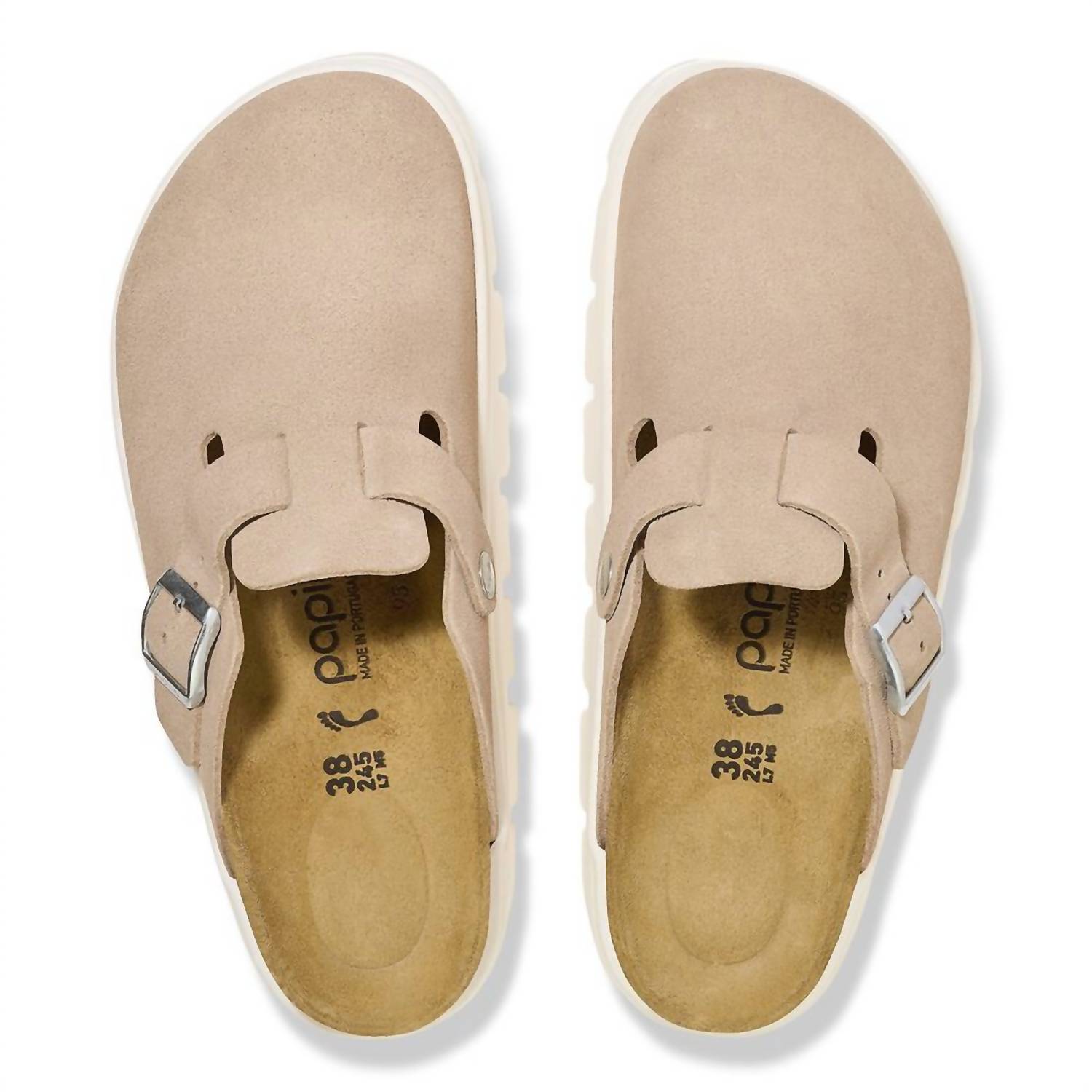 This sandal will take you from brunch to dinner and everything in between. Step into style and comfort with the Women's Boston Papillio Chunky Sandal by BIRKENSTOCK, crafted in Germany. These warm sand clogs feature a low, 1.18-inch chunky heel and a round toe, making them perfect for year-round wear. Made from incredibly soft suede, they are designed with an anatomically shaped cork-latex footbed and smooth suede lining, ensuring a perfect fit that hugs your foot like a second skin. The adjustable metal pin buckle and EVA platform sole with extra deep tread lines offer both stability and a stylish appearance.