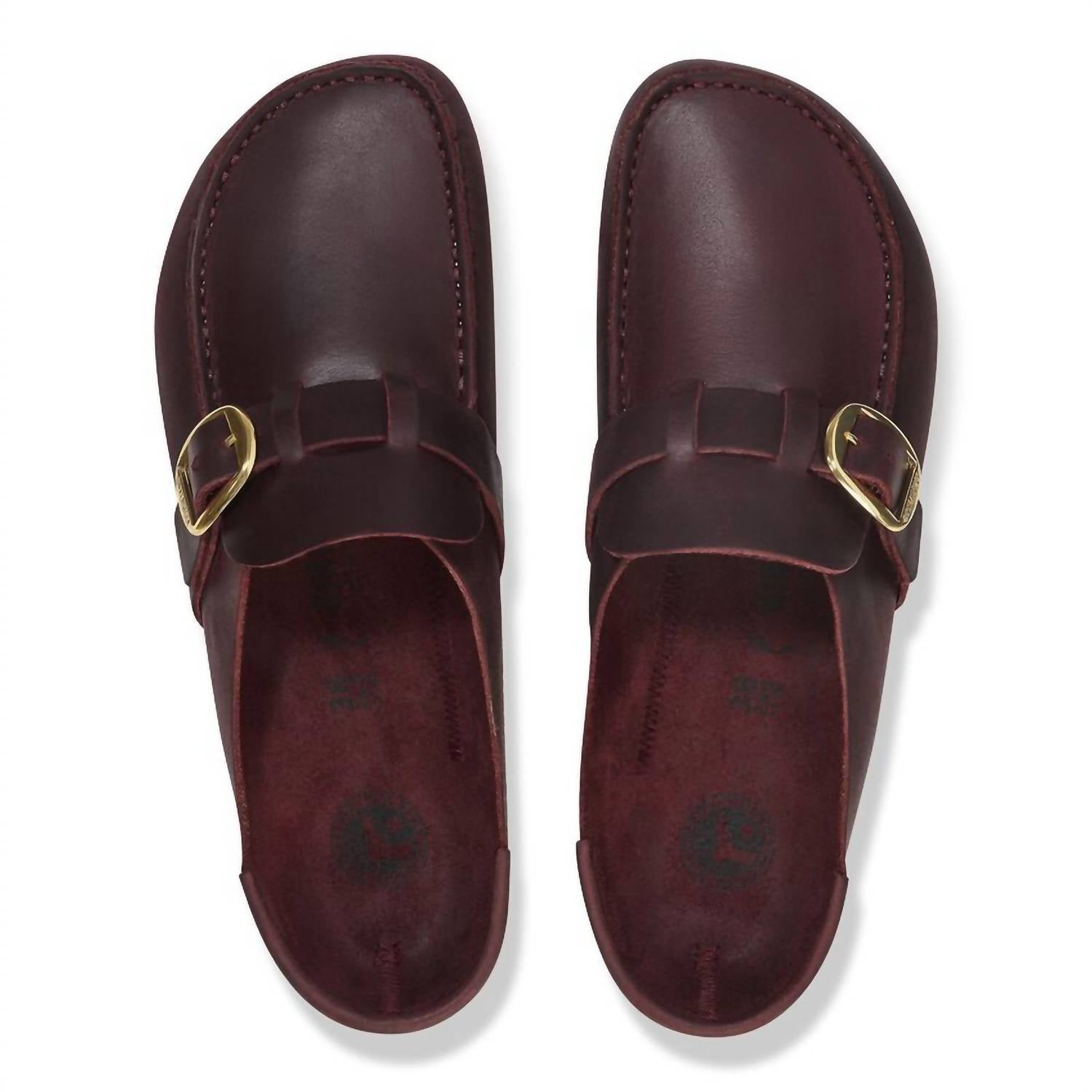 Slip them on and go! Experience comfort with the Women's Buckley Unlined Moc-Toe Clog by BIRKENSTOCK, now in Zinfandel. With a flexible EVA sole and contoured cork-latex footbed, these clogs offer custom support. The oiled leather upper features signature moccasin stitching and an adjustable strap with a metal pin buckle for a snug fit. Made in Germany, the suede footbed lining improves with wear. Suitable for medium width, these clogs have a flat heel and round toe, making them versatile for any wardrobe.