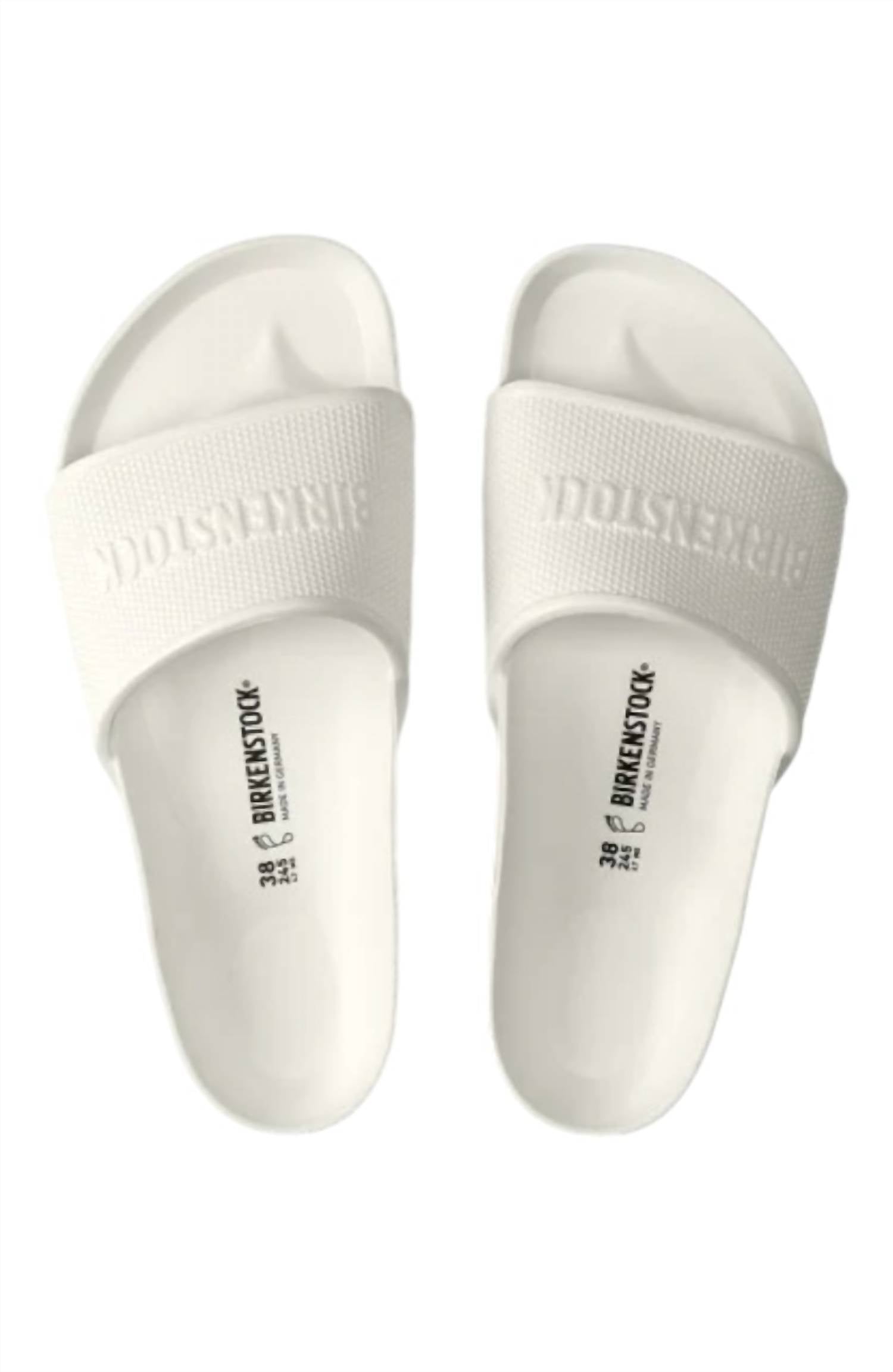 Flowy dresses, cropped pants, and even jumpsuits... this sandal works with them all! Sporty slide design with embossed upper and logo lettering. Made from one piece of light, flexible, and waterproof molded EVA. Anatomically shaped BIRKENSTOCK footbed made from EVA. Upper, footbed lining, and sole: molded single piece of EVA. Waterproof, washable, and ultra-lightweight. Made in Germany.