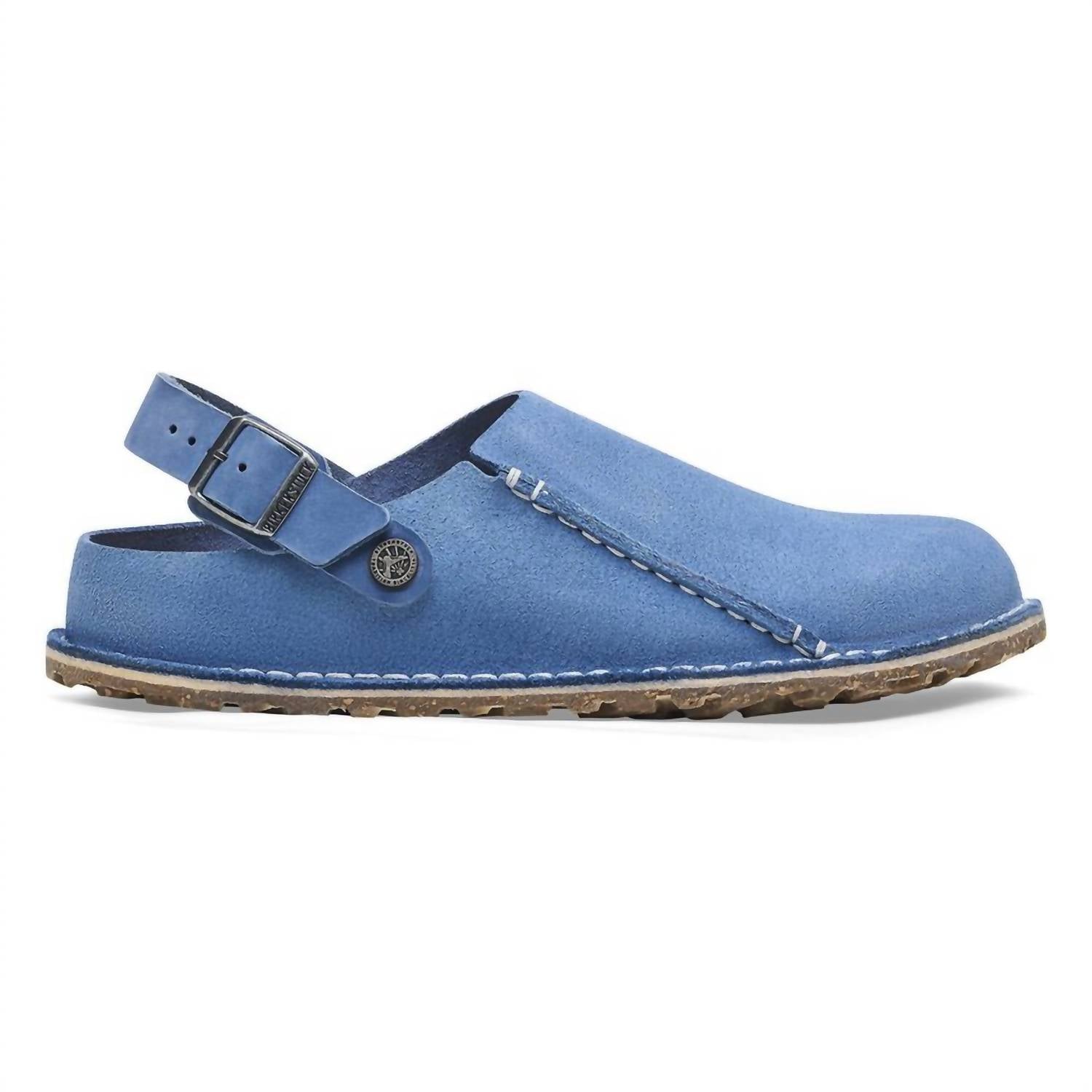 So comfy it's like you're walking on clouds. Discover the Women's Lutry Premium Suede Leather Slipper by BIRKENSTOCK in Elemental Blue, perfect for travel this spring. Crafted from soft suede and nubuck leather, it features a removable, anatomically shaped cork-latex footbed and a natural rubber sole with cork elements for superior comfort. The flexible ankle strap and individually adjustable metal pin buckle ensure a customized fit. Footbed made in Germany; experience the premium feel with a suede lining that absorbs moisture and provides a soft touch.