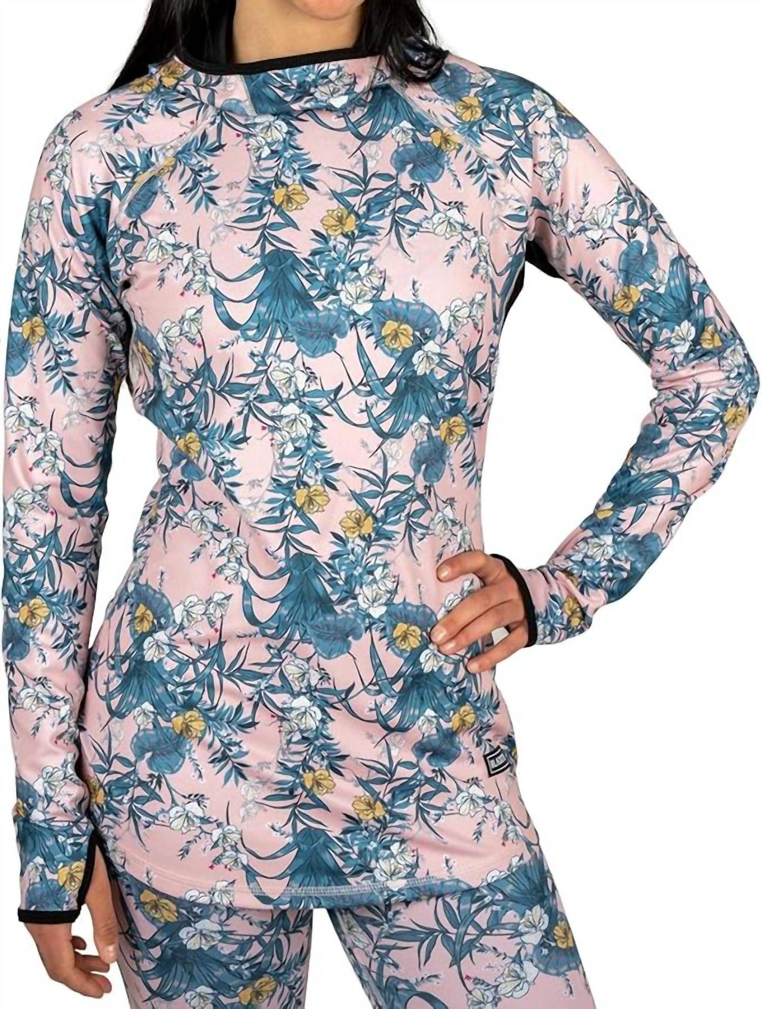 Introducing the Cloudchaser Hooded Top by BlackStrap, a cutting-edge midweight base layer designed for women who demand both performance and style. This Floral Zen hoodie features long sleeves, a full contoured hood, and a custom drop hem design for a flawless fit. The versatile polyester material is engineered with VERSA fabric technology for breathability and 4-way stretch, ensuring optimum maneuverability. With attributes like vented armpits, thumb holes, quick-dry and moisture-wicking capabilities, as well as UPF 50+ protection, this pull-on design is perfect for active pursuits. Care: Machine wash and tumble dry for easy maintenance.