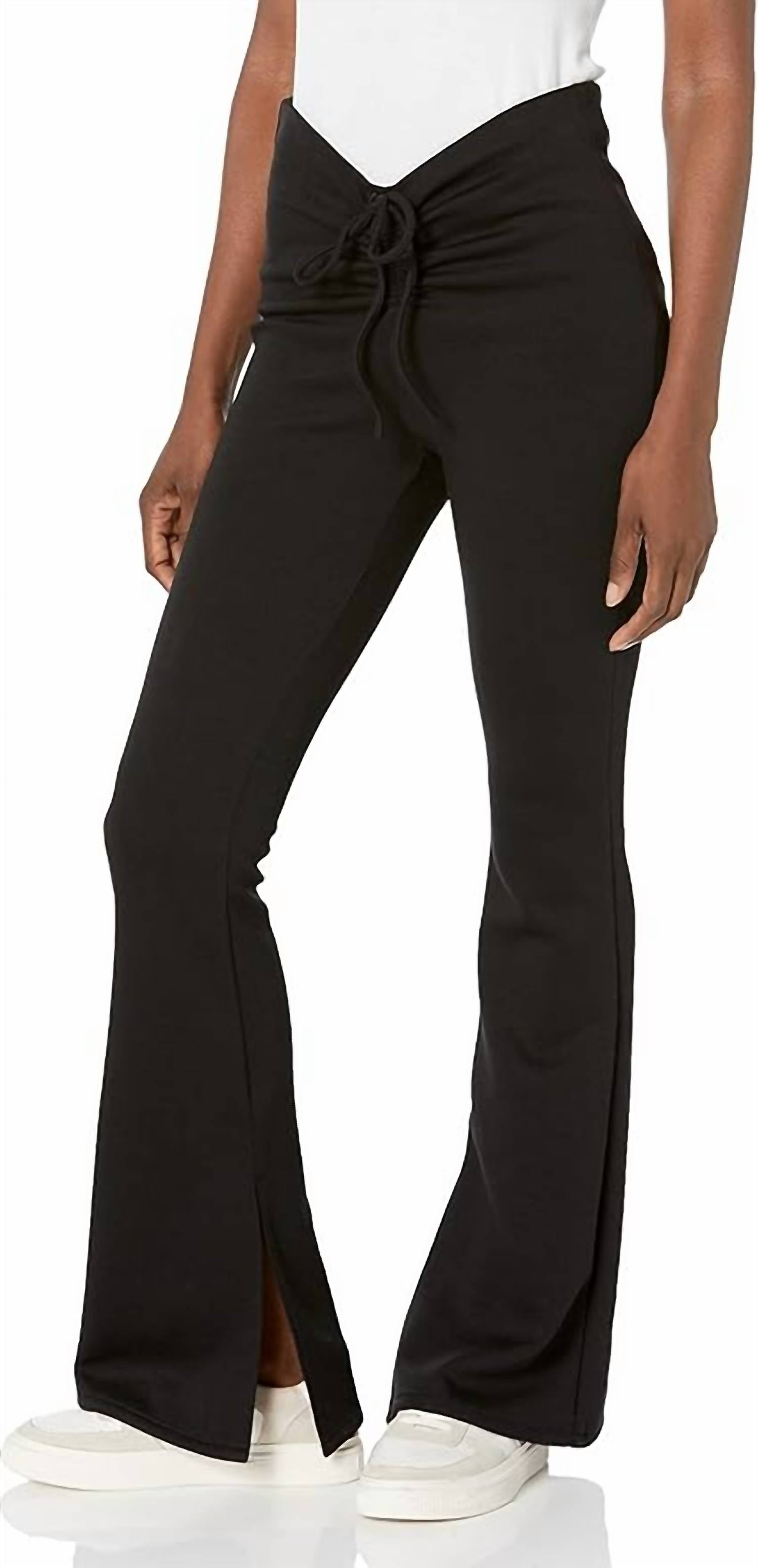 Black Flare Pants with Drawstring Front by Blank NYCRuched drawstring front at waistband slims the waist.Material: Rayon, poly, spandex blendJersey fabric with split detail at cuffs, bell bottoms ruched comfy long boot cut stretchy soft