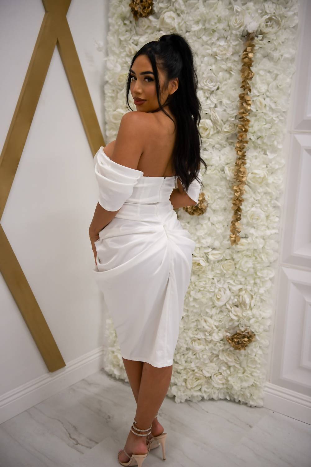 The perfect mini dress for those warmer months. Introducing the Stephanie Corset Midi Dress by Blithe in an alluring floral pattern in white, perfect for an evening event. This romantic dress features an off-the-shoulder neckline with draped detailing and a structured, lace-accented bodice for a bodycon fit. Made from 95% Polyester, 5% Spandex, it includes sheer lace side panels with corset lacing for a flattering hourglass effect. The gathered skirt in a midi length is completed with a zip closure.
