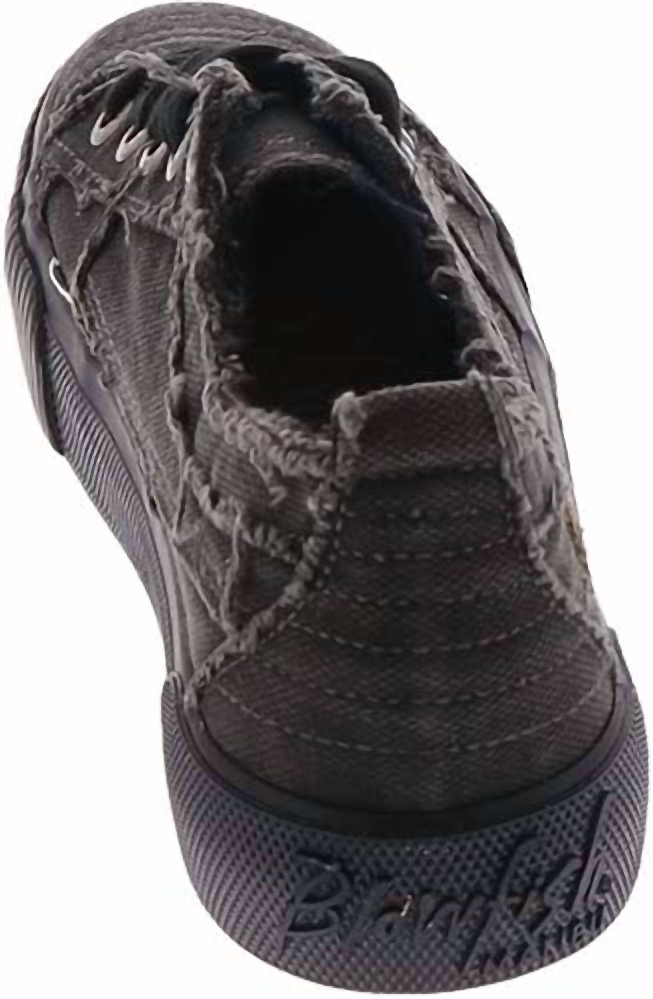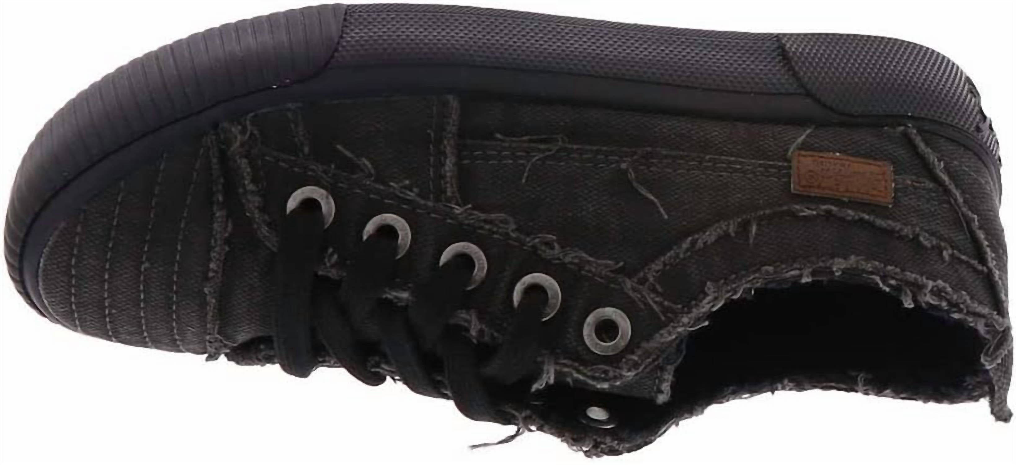 Introducing the Women's Clay Sneaker by BLOWFISH, a sleek low-profile shoe perfect for vacation and streetwear. Crafted with canvas fabric uppers in a striking Black Smoked Black Foxing color, these sneakers come with a practical laced closure and a cushioned foam footbed for extra comfort. They feature fabric linings and a durable vulcanized platform midsole with a rubber traction outsole. Designed with a round toe and flat heel, these sneakers are ideal for women seeking both style and functionality during spring escapades.