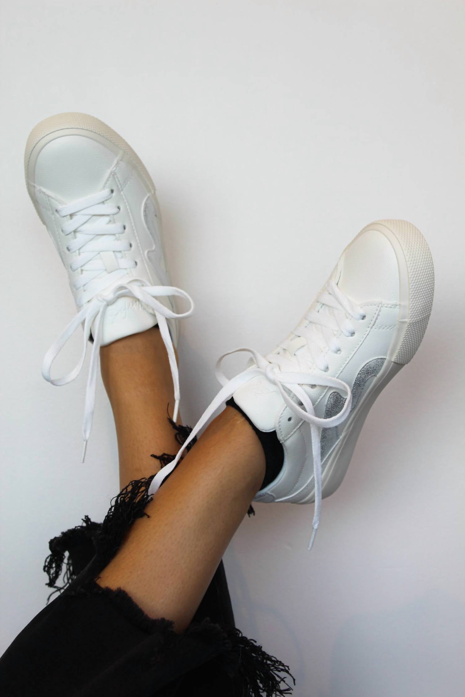 Cute, functional, and comfortable. These sneakers check all the boxes. Featuring classic white design accented with silver metallic details. Polyurethane upper. Logo design at heel notch and quarter. Lace-up closure. Round-toe silhouette. Cotton lining. Rubber outsole. True to size fit.