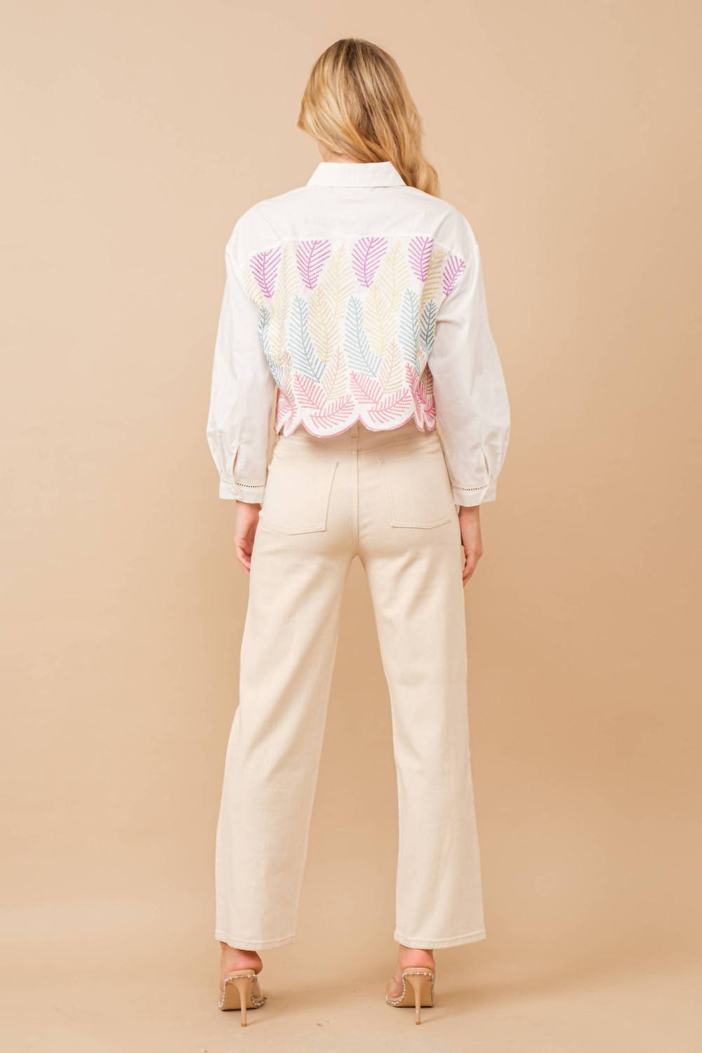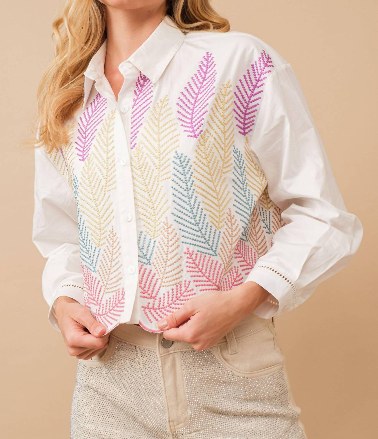 The Aurora Metallic Embroidery Shirt by Blue B is a unique addition to any wardrobe, ideal for a dinner party or spring occasion. This patterned button-up blouse showcases long sleeves alongside a fun blend of metallic threads and an embroidered leaf design in a striking purple-pink color. The scallop edge adds a playful touch to the collar neckline. With a convenient button closure, this shirt lets you dazzle with ease.