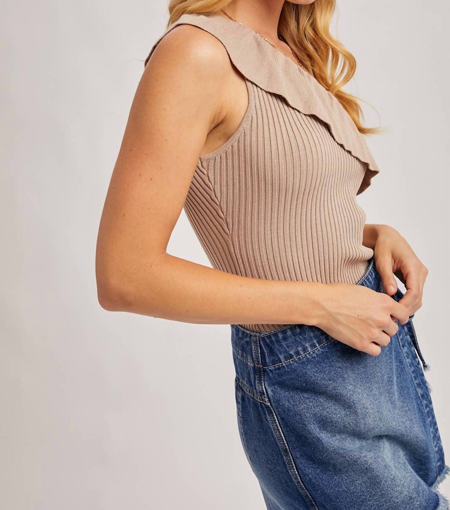 Elevate your evening style with the Gemma Ruffled One Shoulder Top from BluIvy, a sand-colored sleeveless piece perfect for a chic dinner party. Crafted from a textured viscose blend, this top features a figure-skimming ribbed knit and an asymmetrical off-the-shoulder neckline. Closure is a convenient pull-on style. Model is 5'9" and wearing a size small; sizes run true to size (Small 2/4, Medium 6/8, Large 10/12). Ideal for New Year's Eve or embracing the Y2K trend.