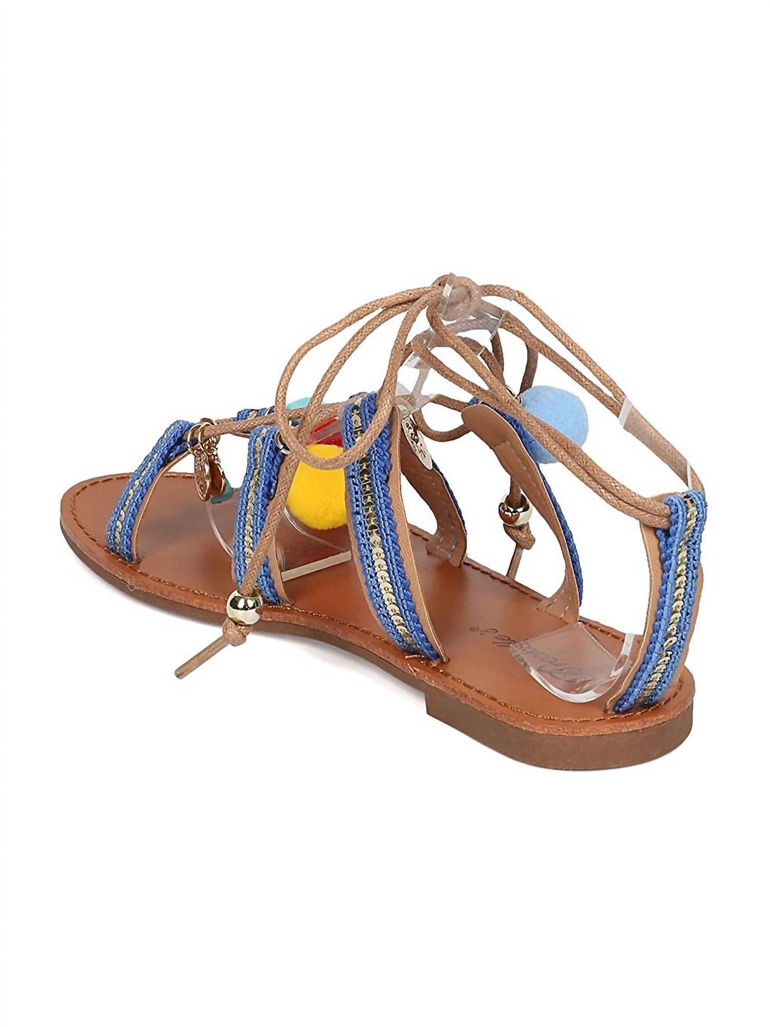 Step into summer style with the Women's Kylee Pom Pom Open Toe Tie Up Gladiator Sandals by Breckelles, showcasing a vegan mixed media upper and boho chic strappy design. These natural nude sandals feature an open toe and a flat heel measuring 0.25 inches, perfect for vacation wear. A playful addition to any outfit, they come adorned with charming pom pom details and dangling charms, featuring a self-tie closure for a customizable fit. Enjoy their true-to-size comfort in signature bohemian flair.