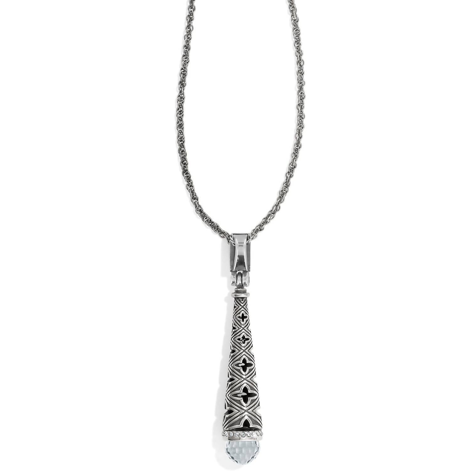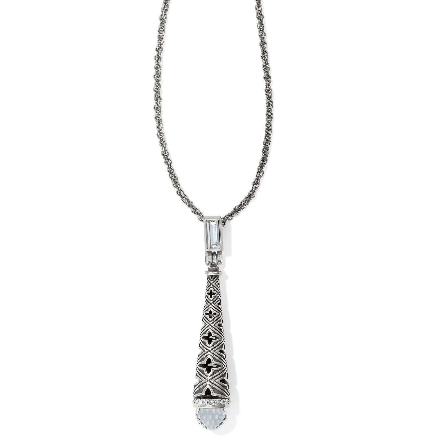 The perfect stand-out necklace that complements even the most basic t-shirt. The Castillo Necklace by Brighton captures the essence of medieval architecture with its elegant tower-shaped pendant. Crafted from sterling silver and adorned with flush-set Swarovski crystals, this piece exudes timeless sophistication. Ideal as a fashion statement, the necklace showcases a beautifully faceted domed crystal at its center. This stunning silver creation is the perfect addition to any jewelry collection.