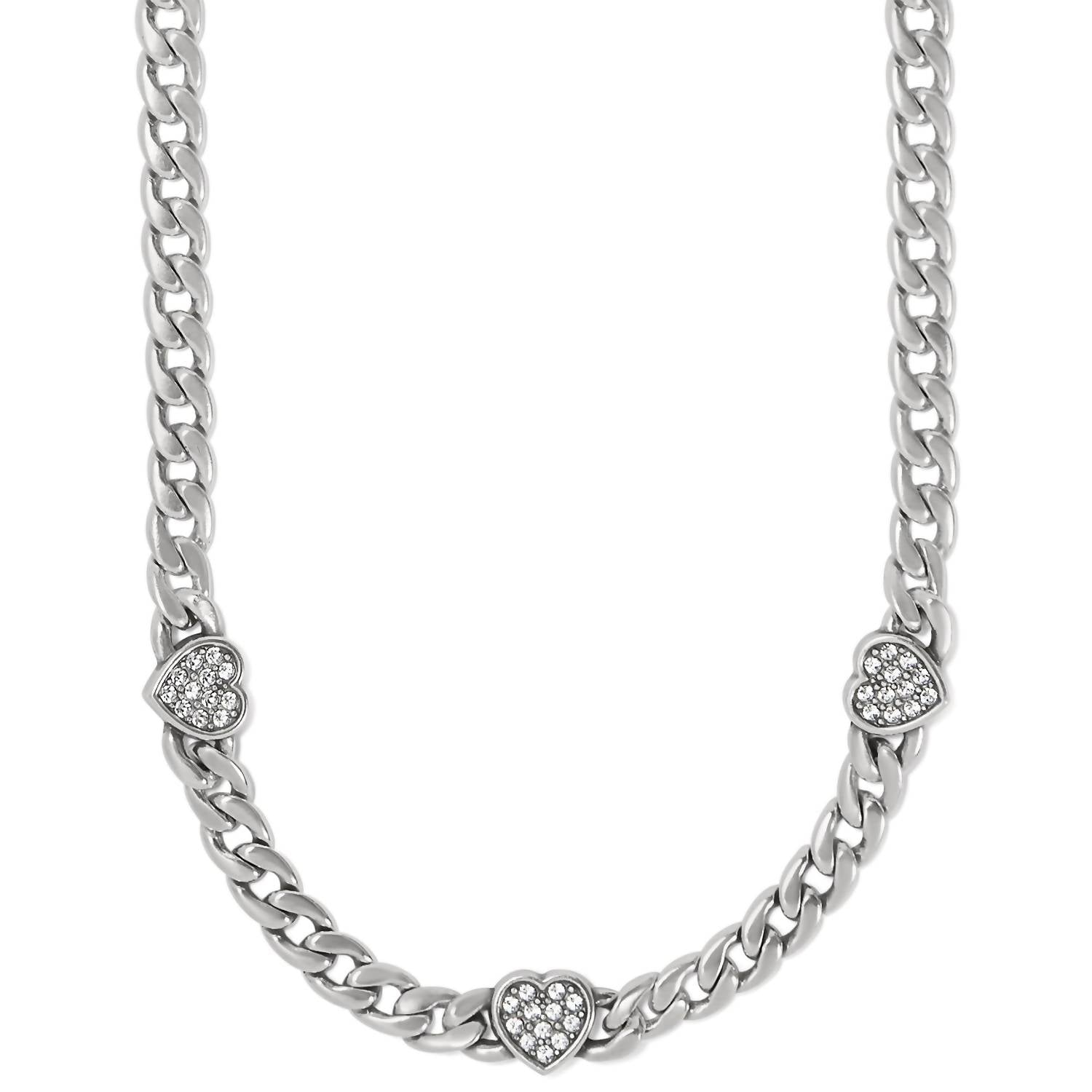 Presenting the Women's Cleo Heart Reversible Necklace by Brighton, an exquisite piece inspired by Cleopatra's elegance. This silver fashion necklace is adorned with three pave hearts and features a modern curb chain design. The piece is crafted from fine quality crystals, enhanced with silver plating, and offers an adjustable length of 16" to 18". Closure: Lobster claw. Enjoy its reversible design for versatile styling.