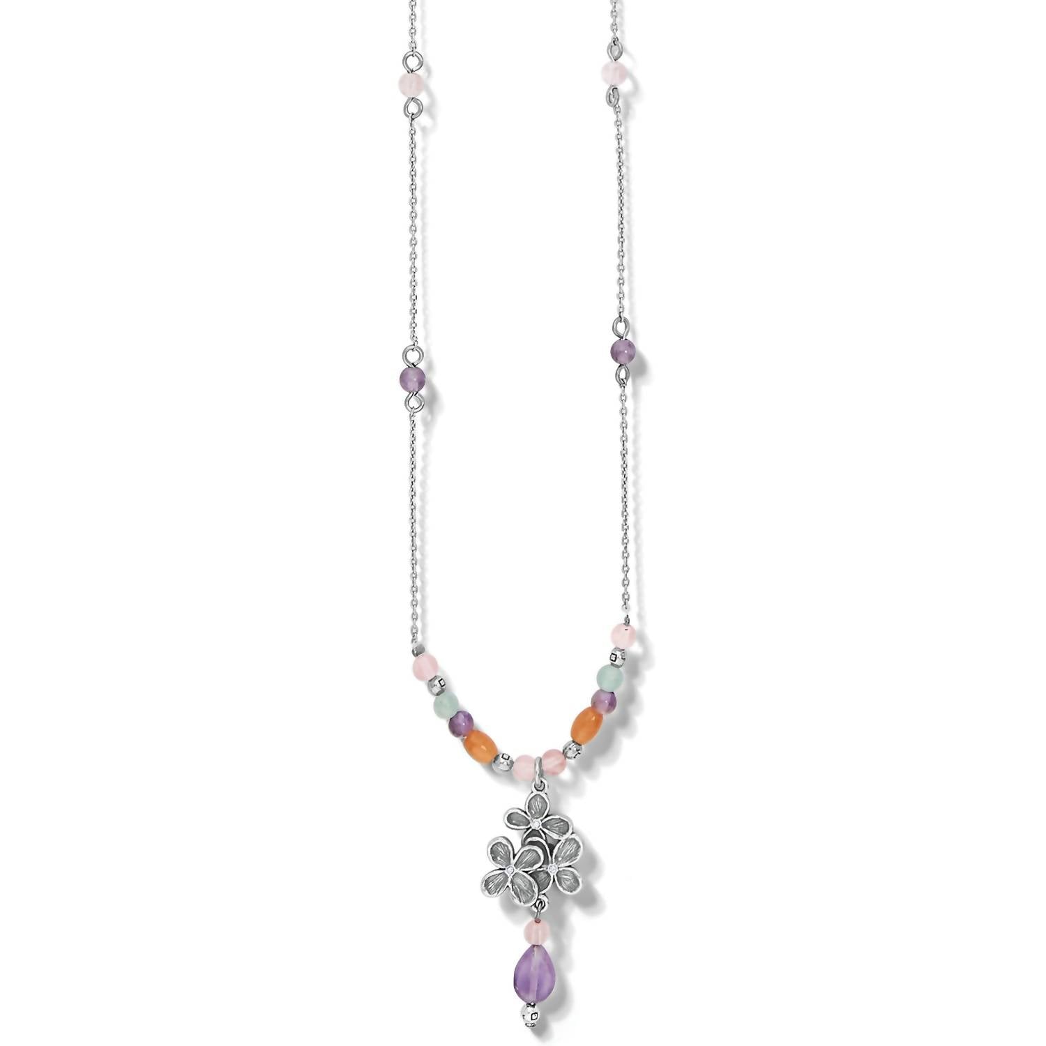 The perfect stand-out necklace that complements even the most basic t-shirt. Discover the Everbloom Trellis Drop Necklace by Brighton, a stunning accessory in a captivating silver-multi color. This adjustable necklace measures 18" to 21" in length and features a 1 5/8" silver plated pendant adorned with semi-precious stones including cherry quartz, amethyst, peach aventurine, and green aventurine. Crafted with fine quality crystals, it boasts a delicate lobster claw closure for secure wear.