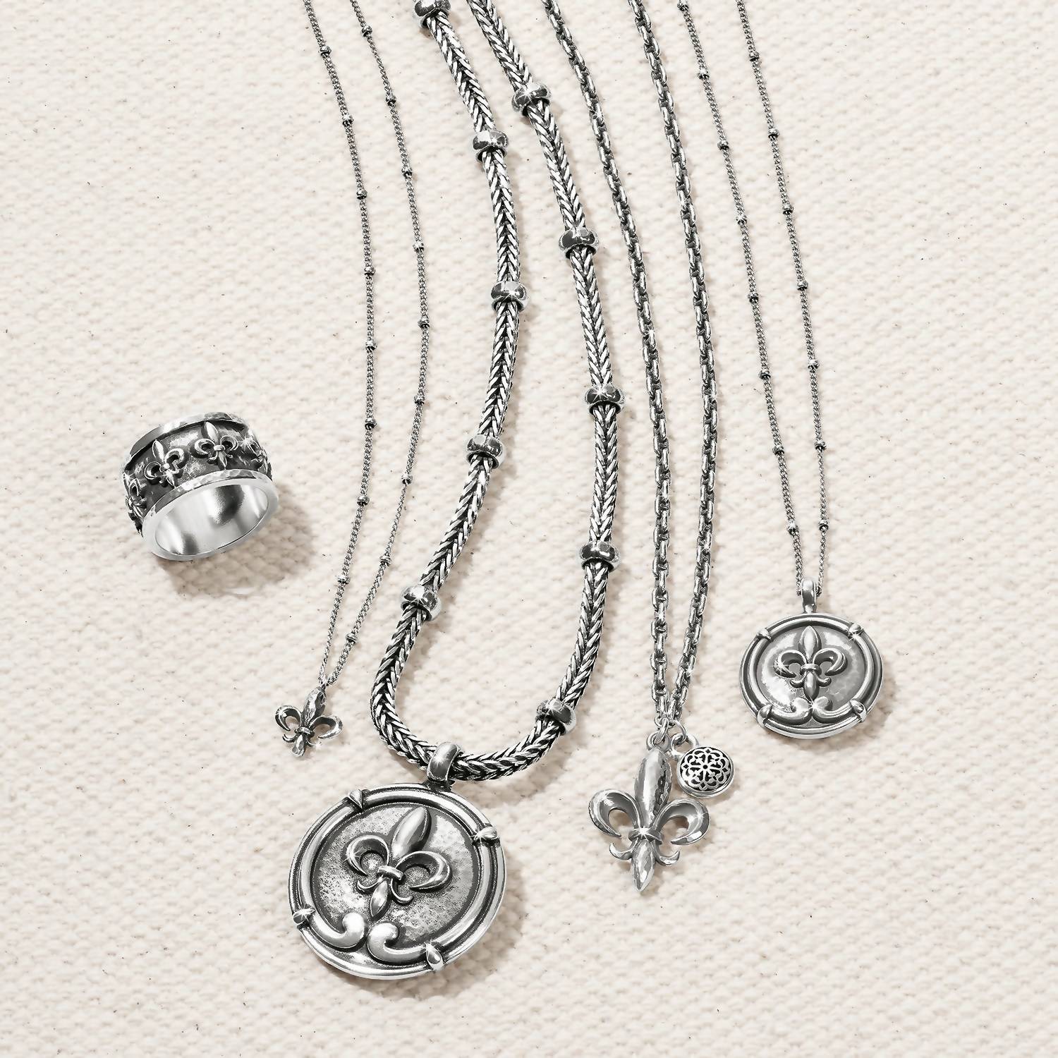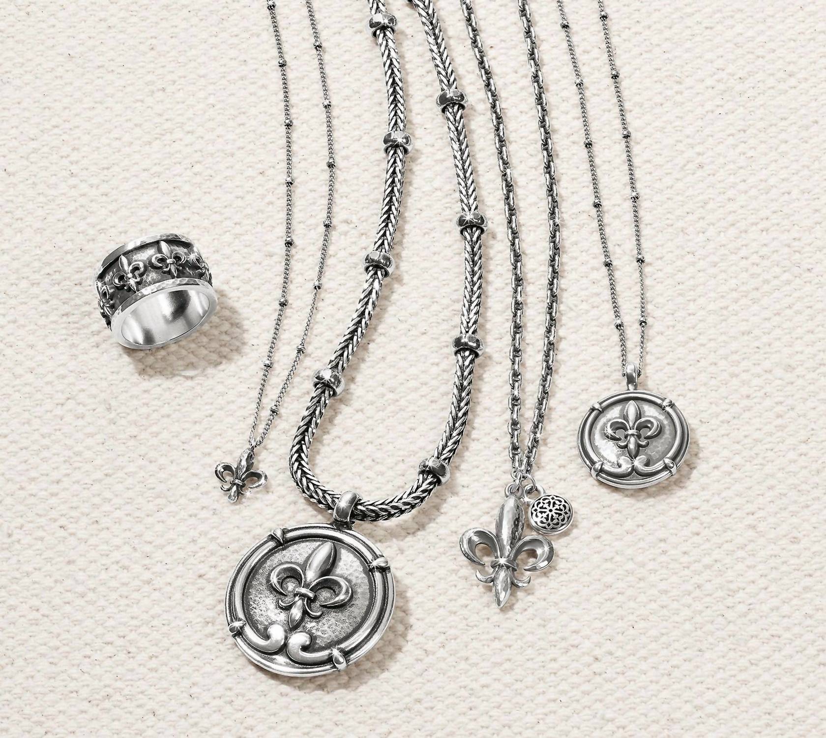 The perfect stand-out necklace that complements even the most basic t-shirt. Discover the alluring Ferrara Collection's Women's Fleur De Lis Small Coin Necklace by Brighton, a piece that celebrates timeless elegance. This fine necklace, in a sophisticated silver finish, features a coin-shaped pendant adorned with a fleur de lis, symbolizing the rich history of Florence, Italy. With a length of 18" - 20" adjustable and a 1" pendant drop, it ensures a perfect fit for any outfit. Closure: Lobster claw. Material: Silver plated. Perfect for adding a touch of classic refinement to any ensemble.