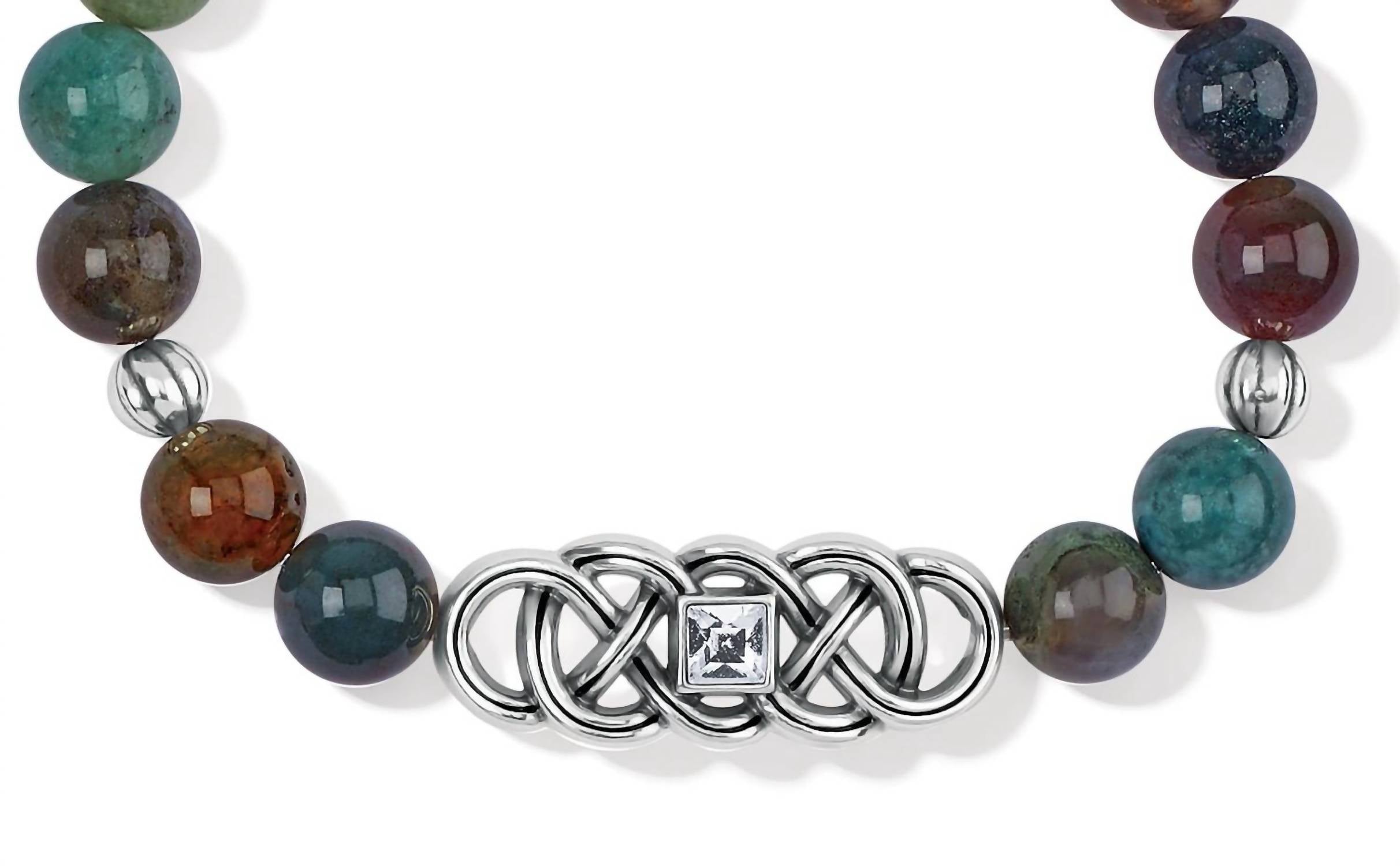 Stacked or solo - you can't go wrong with this bracelet. Introducing the Women's Interlok Lustre Bracelet by Brighton, a stunning accessory crafted with fine quality crystal and semi-precious jasper. This fashion bracelet, plated in silver, showcases a Celtic knot motif, symbolizing everlasting love and friendship. Designed in a versatile blue color, it features a comfortable stretch closure for easy wear. Width: 3/8".