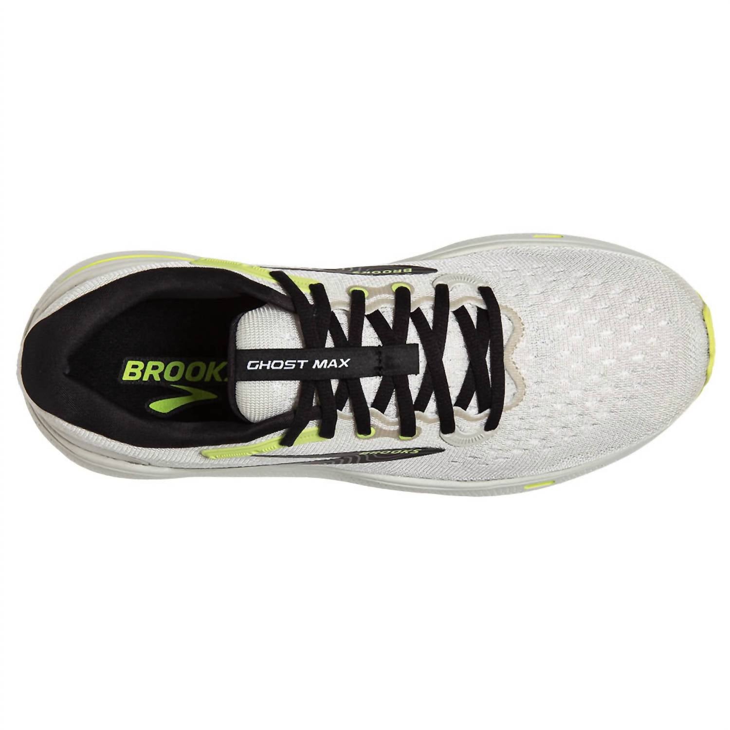 Introducing the Men's Ghost Max Running Sneakers by Brooks, designed to elevate your athletic performance. These sneakers are crafted with recycled materials, accentuated in a vibrant Grey, Black, and Sharp Green palette, offering both style and sustainability. The sneakers boast high-stack DNA LOFT v2 cushioning and a GlideRoll Rocker for optimal comfort and support, complemented by a flat heel and round toe for a balanced stride. Perfect for fitness, workouts, road running, and everyday activities, these shoes accommodate medium width and offer a low heel height.