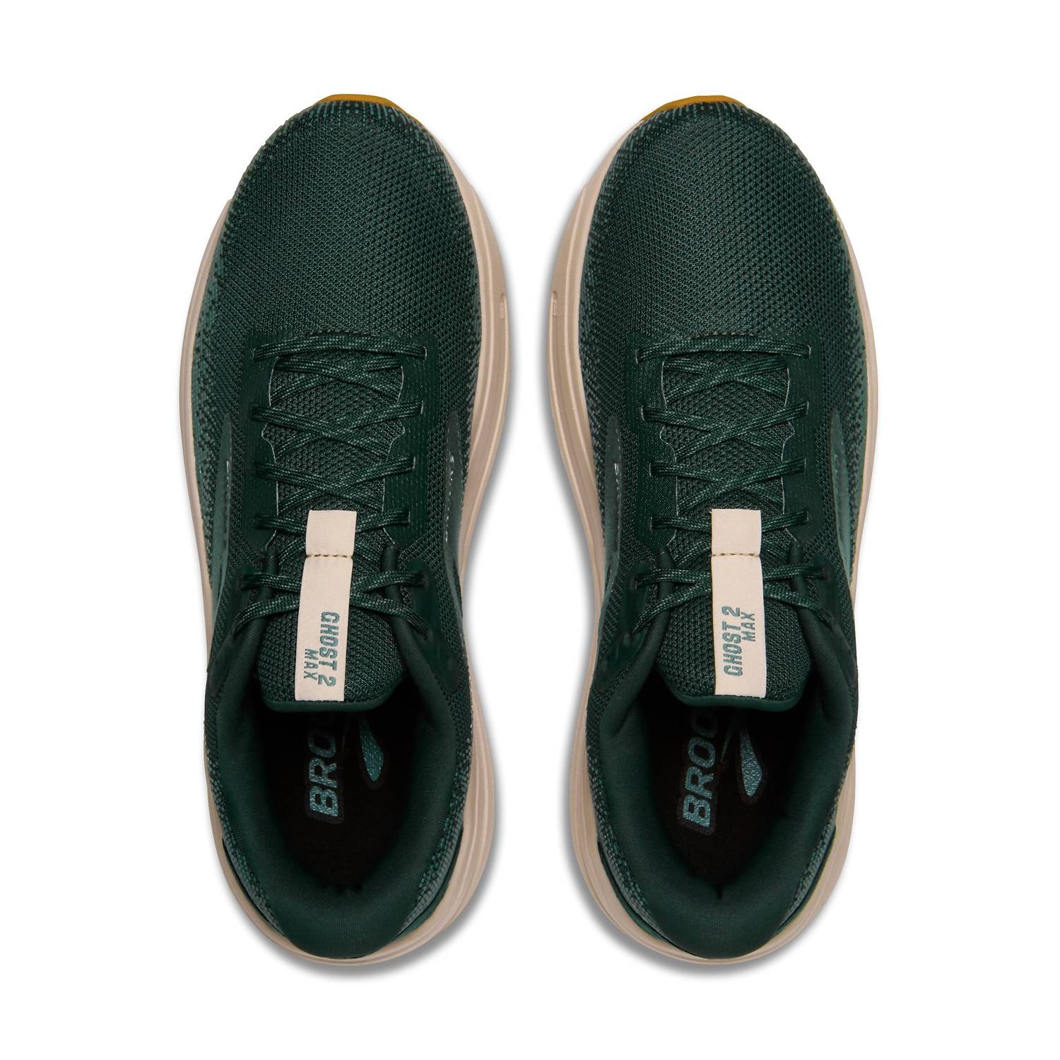 Introducing the Men's Ghost Max V2 Athletic Shoes by Brooks, designed for optimal performance in a striking pine color. These shoes are perfect for summer workouts with their round toe shape and flat heel, ideal for enhancing your fitness routine. Perfect for the athleisure trend, these shoes offer functionality and style for the modern man. Embrace the season with shoes tailored for comfort during fitness activities and workouts.
