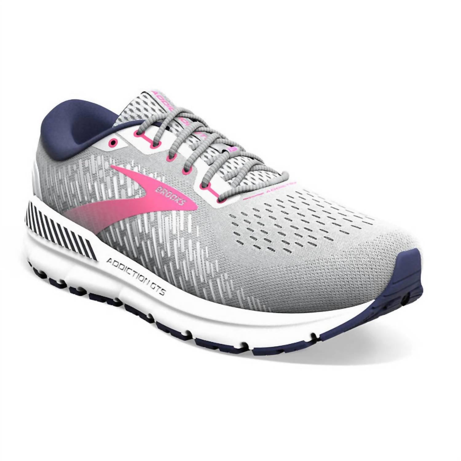 Get your daily steps in with these adorable sneakers. BROOKS Women's Addiction GTS 15 Shoes in Oyster/Peacoat/Lilac Rose offer exceptional comfort for your running needs. Designed with smart support and a roomy fit, these sneakers feature a breathable upper and a midsole drop of 12mm for smooth transitions. Weighing 11.1oz (314.7g), they ensure more cushioning for universal fit, making them perfect for athleisure and summer game days. Complete with a round toe and flat heel, these sneakers are ideal for a comfortable and stylish workout.