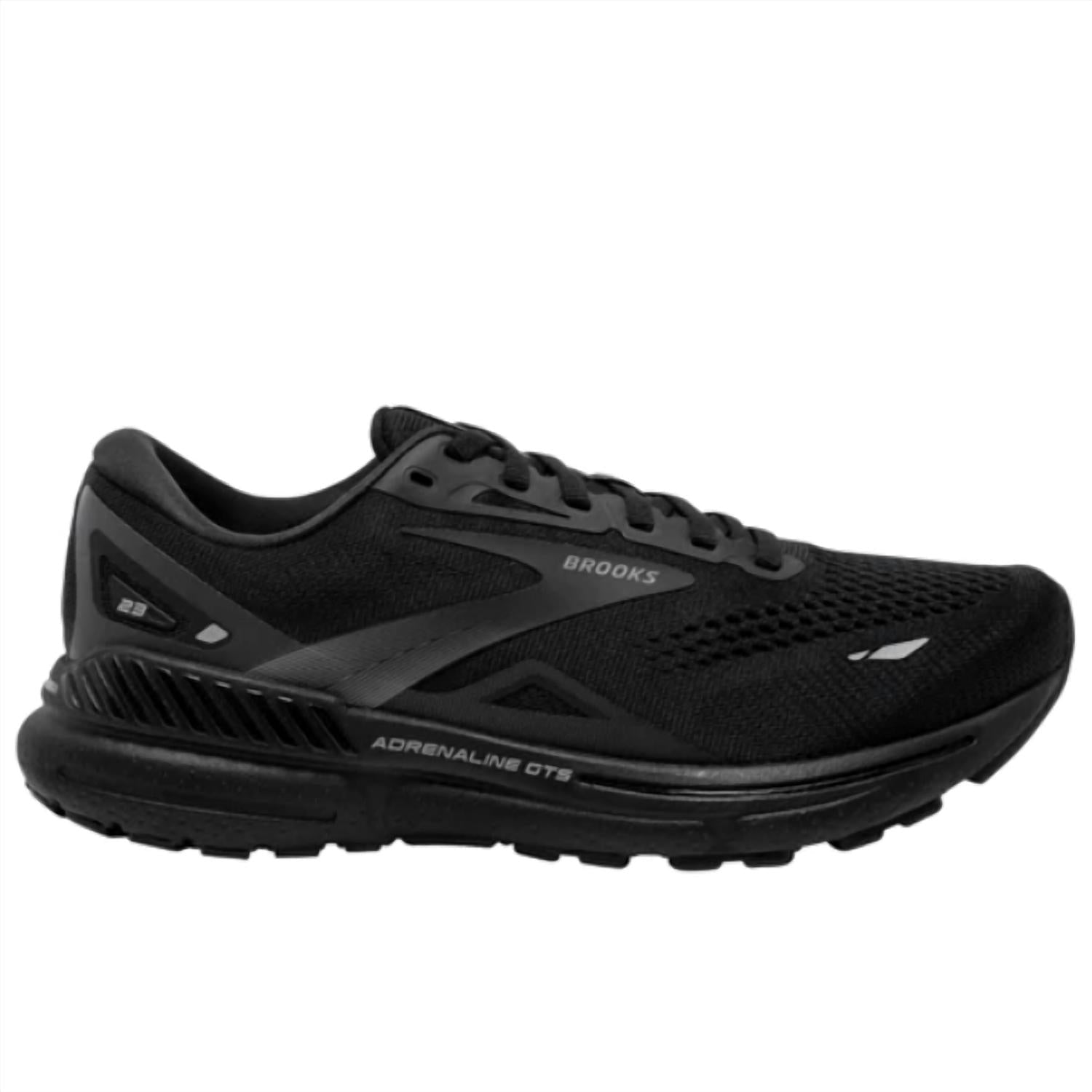 When fashion meets function. Introducing the Women's Adrenaline Gts 23 Shoes by BROOKS, designed for peak athletic performance. These shoes feature a sleek black-on-black color scheme and a durable rubber composition for superior grip and longevity. With a round toe and flat heel style, they provide comfort and support, perfect for active women. Ideal for a flat heel height of 1 inch and under, these shoes are crafted to enhance your workout experience.