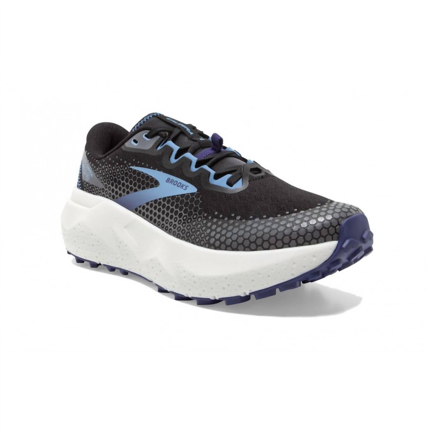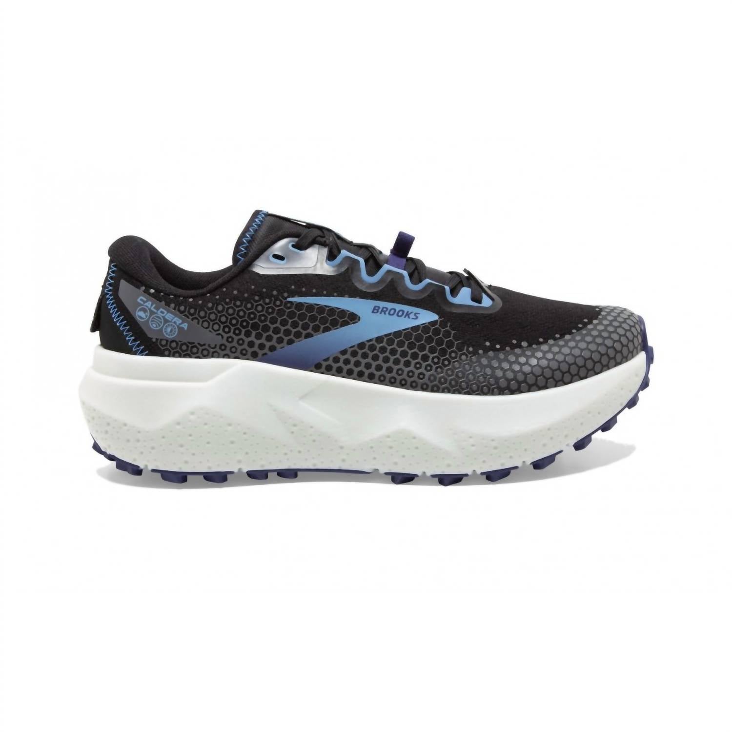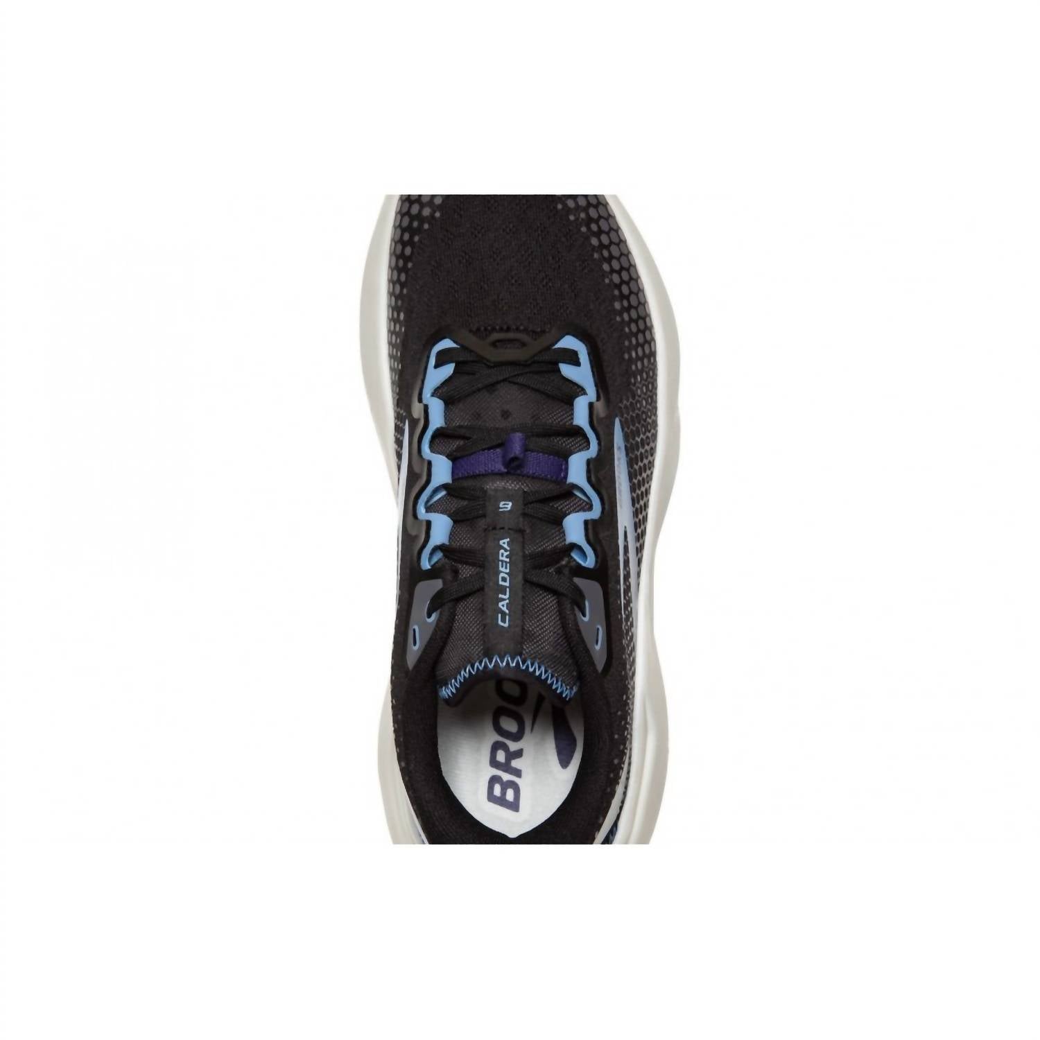 Stylish, comfortable and supportive. These athletic sneakers check all of the boxes. Step onto new trails confidently with the Women's Caldera 6 Trail Running Shoes by BROOKS, featuring a sleek Black/Blissful Blue/Grey design. Engineered for long-distance trail running, these shoes promise reliable traction and cushioning with a nitrogen-infused DNA LOFT v3 for lightweight, plush comfort. A redesigned midsole and outsole provide a secure fit with raised side walls and a widened platform. With a 6mm midsole drop and weighing 9.8oz (277.8g), these medium-width shoes perfectly blend style and functionality, ideal for your next hiking adventure.