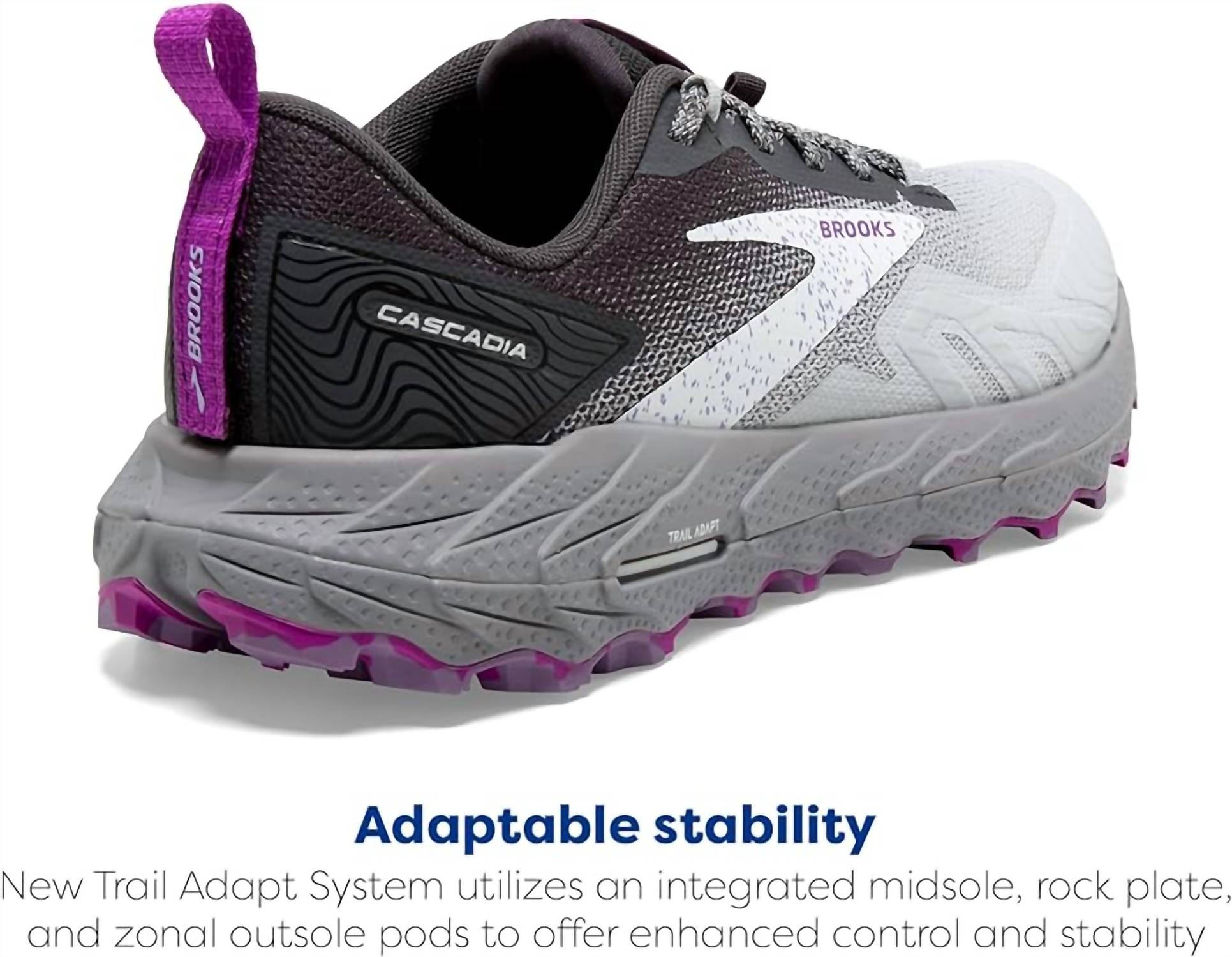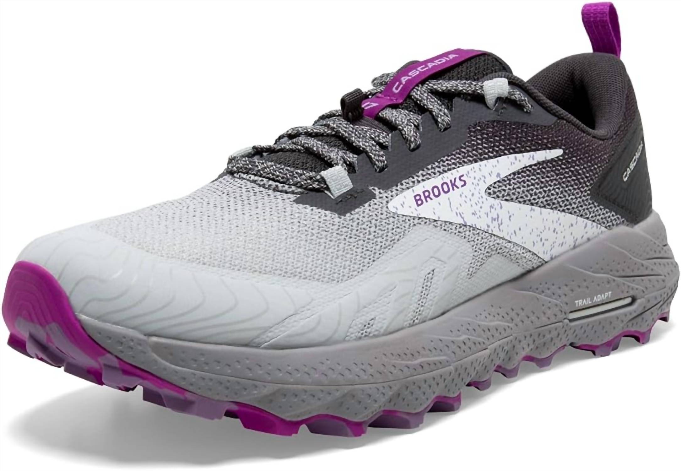 Get your daily steps in with these adorable sneakers. Introducing the Women's Cascadia 17 Trail Running Shoe by BROOKS, designed for trail runners seeking confidence across varied terrains. This shoe offers soft cushioning with DNA LOFT v2 midsole technology to ensure comfort during long trail runs. It features enhanced traction with TrailTack Green for stability on wet and dry surfaces, utilizing 25% recycled content. The integrated Trail Adapt System provides adaptable stability with a rugged midsole, rock plate, and zonal outsole pods for a balanced ride. The articulated Ballistic Rock Shield adds protection while maintaining the flexibility needed for smooth transitions. Available in Oyster/Blackened Pearl/Purple with a round toe and flat heel.