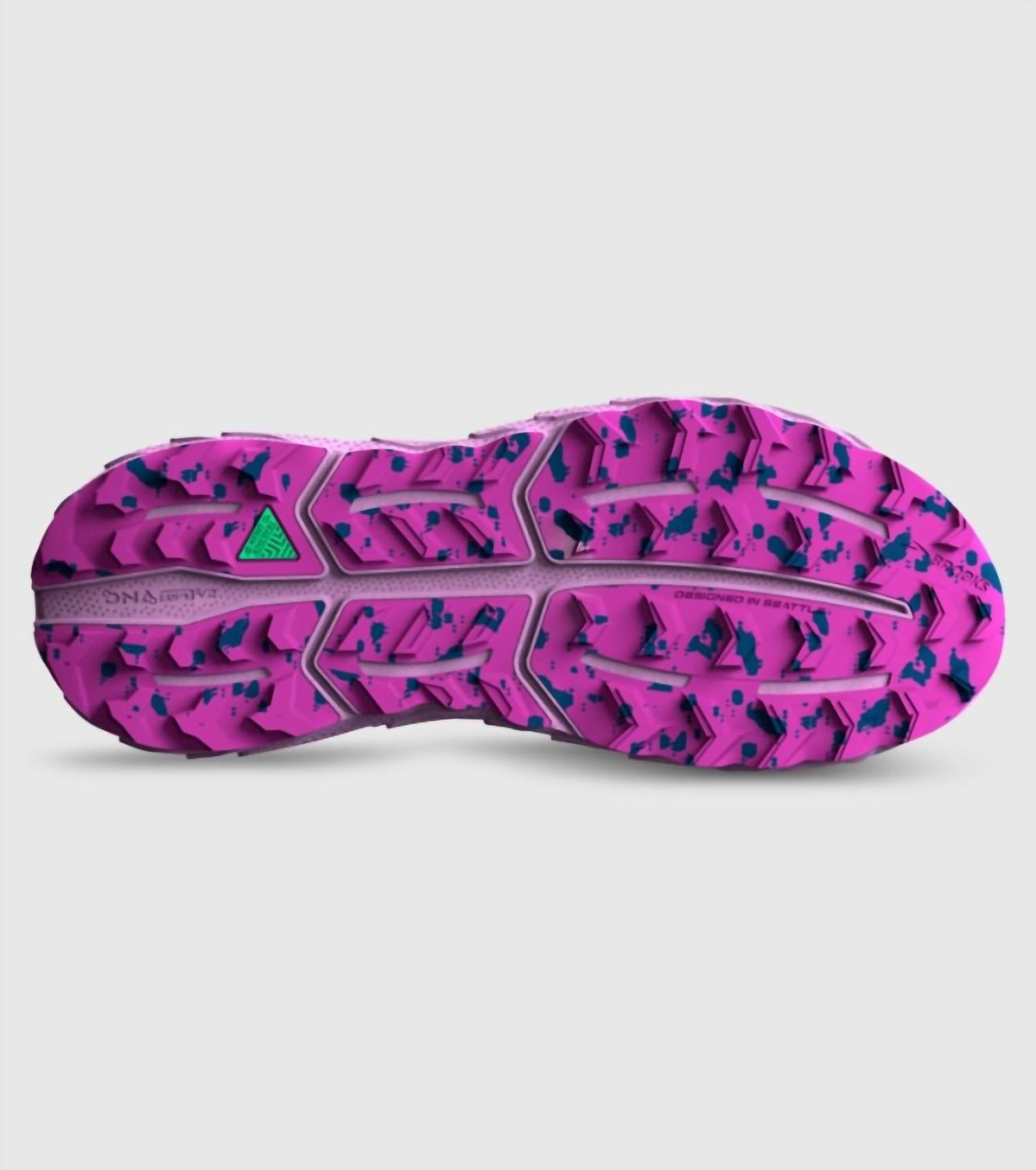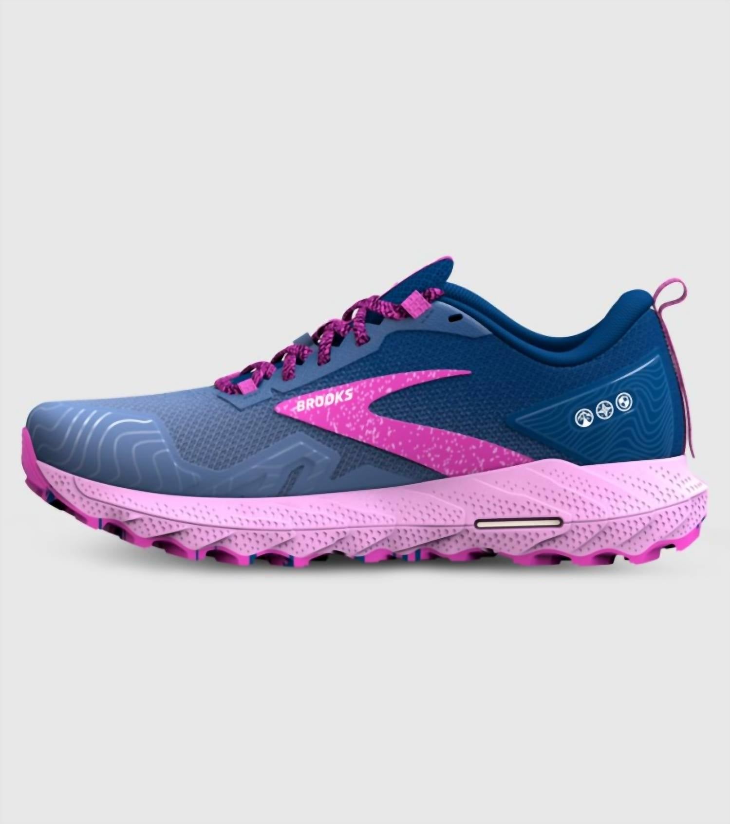 When fashion meets function. Prepare to conquer any trail with the BROOKS Women's Cascadia 17 Trail Running Shoes, designed for those who demand durability and performance. Showcasing a PrintDyed upper integrated with GORE-TEX® Invisible Fit membrane, these shoes promise a lightweight and flexible experience. The Trail Adapt System, featuring a midsole, rock plate, and zonal outsole pods, ensures superior control and stability, complemented by the soft cushioning of DNA LOFT v2 midsole technology. Weighing just 278 grams with an 8mm offset, they feature a round toe shape and a TPU toe cap, all encased in a striking navy, purple, and violet color combination.