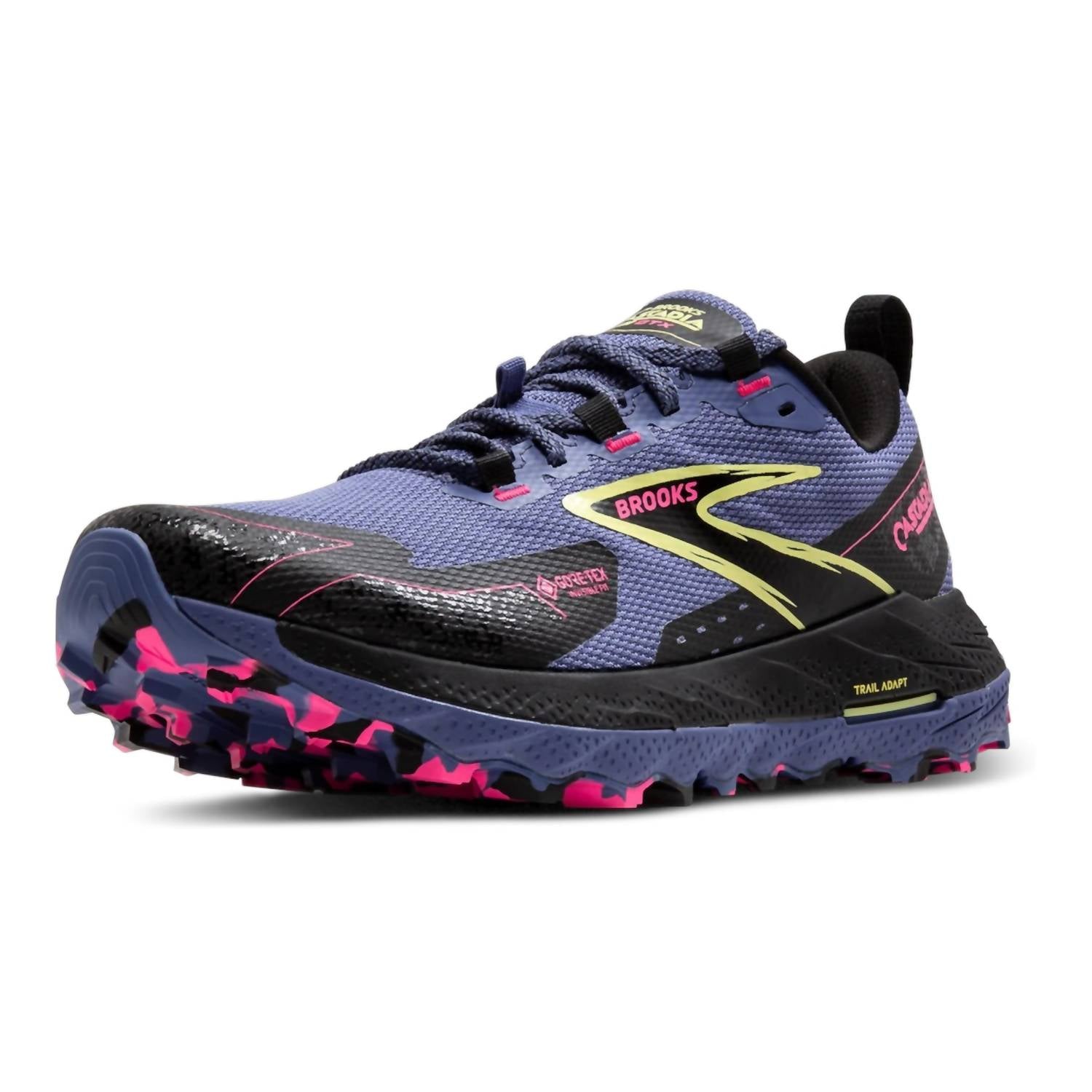 Cute, functional, and comfortable. These sneakers check all the boxes. The Brooks Women's Cascadia 18 GTX Shoes are crafted for athleisure enthusiasts who crave stability on rugged trails. These sneakers feature waterproof GORE-TEX technology in the upper for a light, flexible fit and breathable protection against the elements. The Trail Adapt System, complete with DNA LOFT v2 cushioning and an integrated rock plate, ensures comfort and stability across uneven surfaces. Designed with a TrailTack rubber outsole comprising 25% recycled material, these shoes deliver enhanced traction in Grey Blue, Black, and Pink, perfect for fitness and workout occasions.