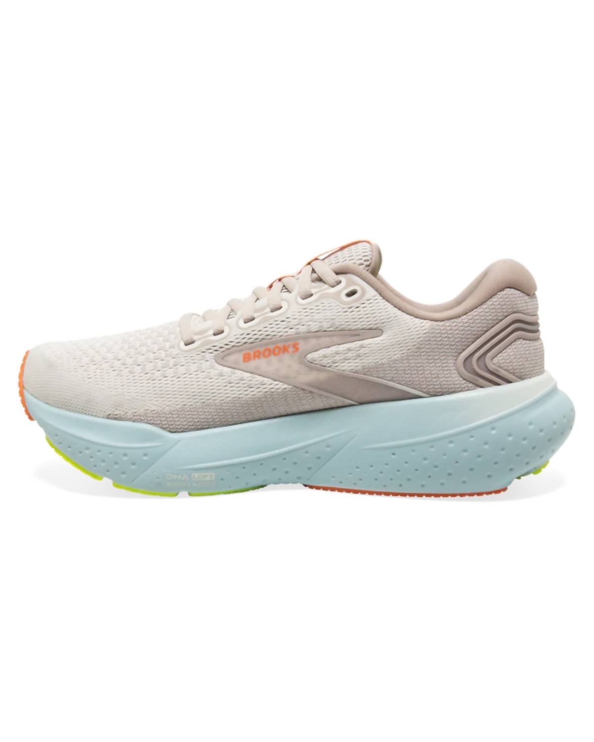 Workout in style with these adorable athletic sneakers. Introducing the Women's Glycerin 21 Shoes by BROOKS, crafted for comfort and style in a striking Coconut, Aqua, and Autumn Sunset colorway. These athletic shoes feature a round toe design and a flat heel with a height of 1" and under, perfect for all-day wear. Made with durable rubber material, they are designed to support your every stride. Ideal for active women seeking both performance and aesthetic appeal.