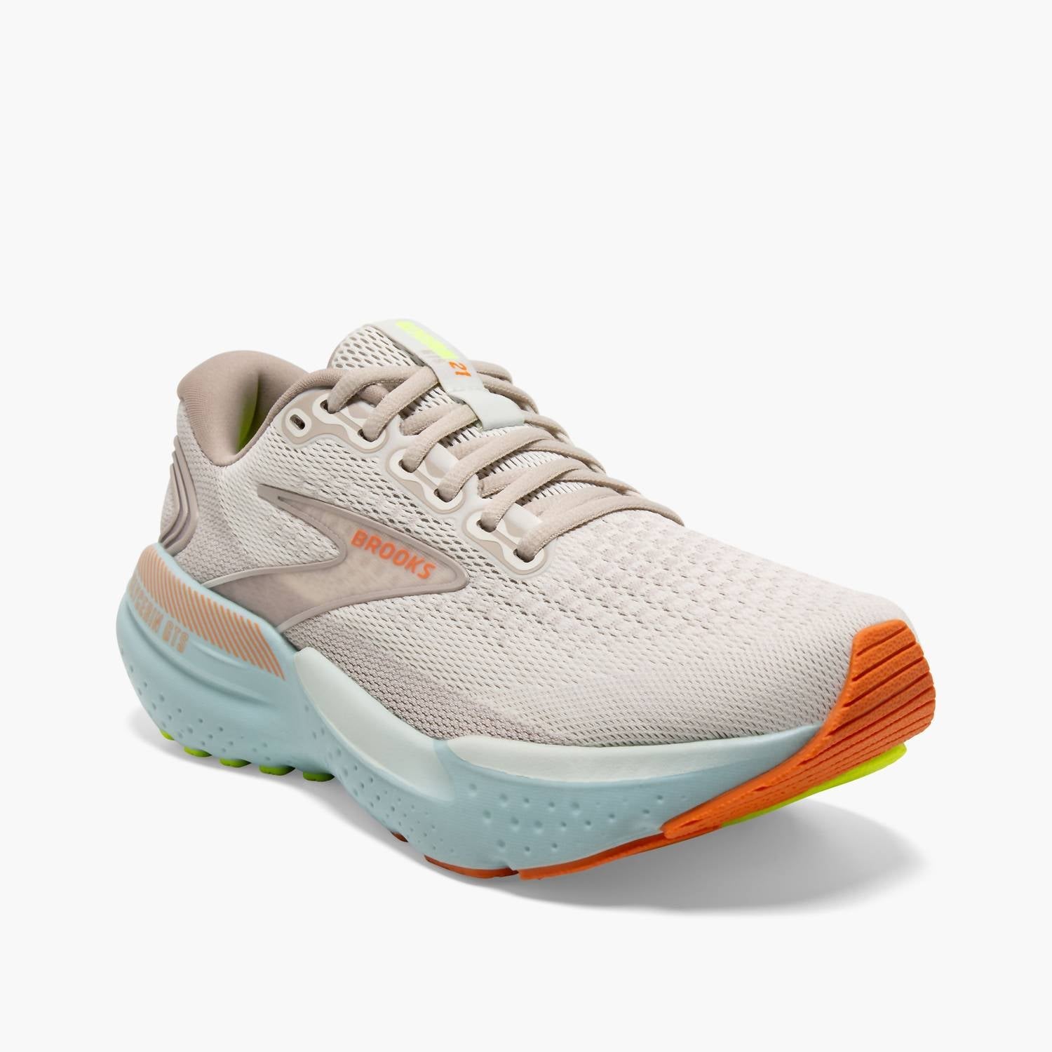 Workout in style with these adorable athletic sneakers. Introducing the Women's Glycerin GTS 21 Running Shoes by BROOKS in an eye-catching Coconut/Aqua/Autumn Sunset colorway, perfect for your athleisure and workout needs. These athletic shoes provide plush cushioning with 2mm extra DNA LOFT v3 for supreme softness, paired with the innovative GuideRails support system for whole-body comfort and stability. Featuring a midsole drop of 10mm and weighing just 9.2oz (260.8g), these shoes deliver soft landings and powerful toe-offs, making them ideal for road running. Sustainability is a priority with 61.1% recycled materials in the upper, offering both comfort and eco-conscious performance.