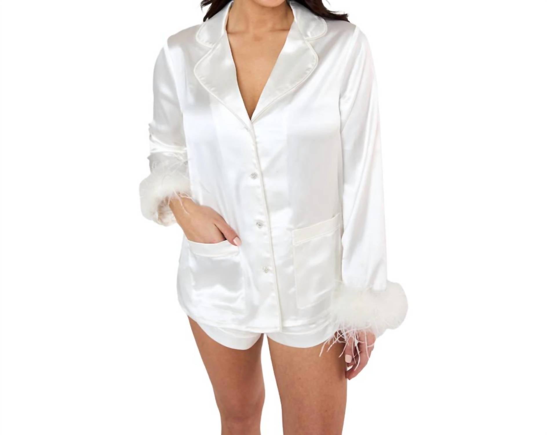 Elevate your bedtime style with the Prescott Feather Trimmed Pajama Set by BUDDYLOVE, designed in a vibrant hot pink shade. This women's loungewear set features a soft button-down top with long sleeves and removable feather cuffs, offering both style and practicality. The set includes cozy, tie-waist shorts, with the top measuring 27 inches and the shorts 11 inches for a comfortable fit. Made from 100% Polyester, this set promises relaxation with a sleek, collar neckline and solid pattern.