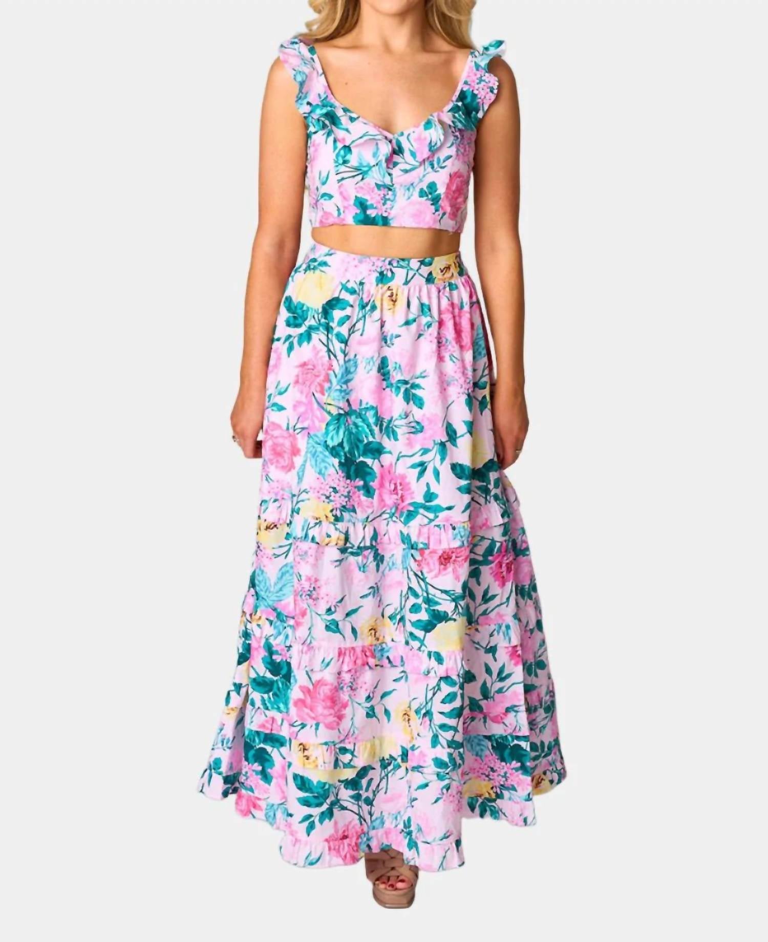 Cropped length. Small measures to be 9.75" from shoulder to hem. Skirt is maxi length and the small measures to be 39" from waist to hem. Smocking on back of waistband. Hand wash. 100% Rayon.